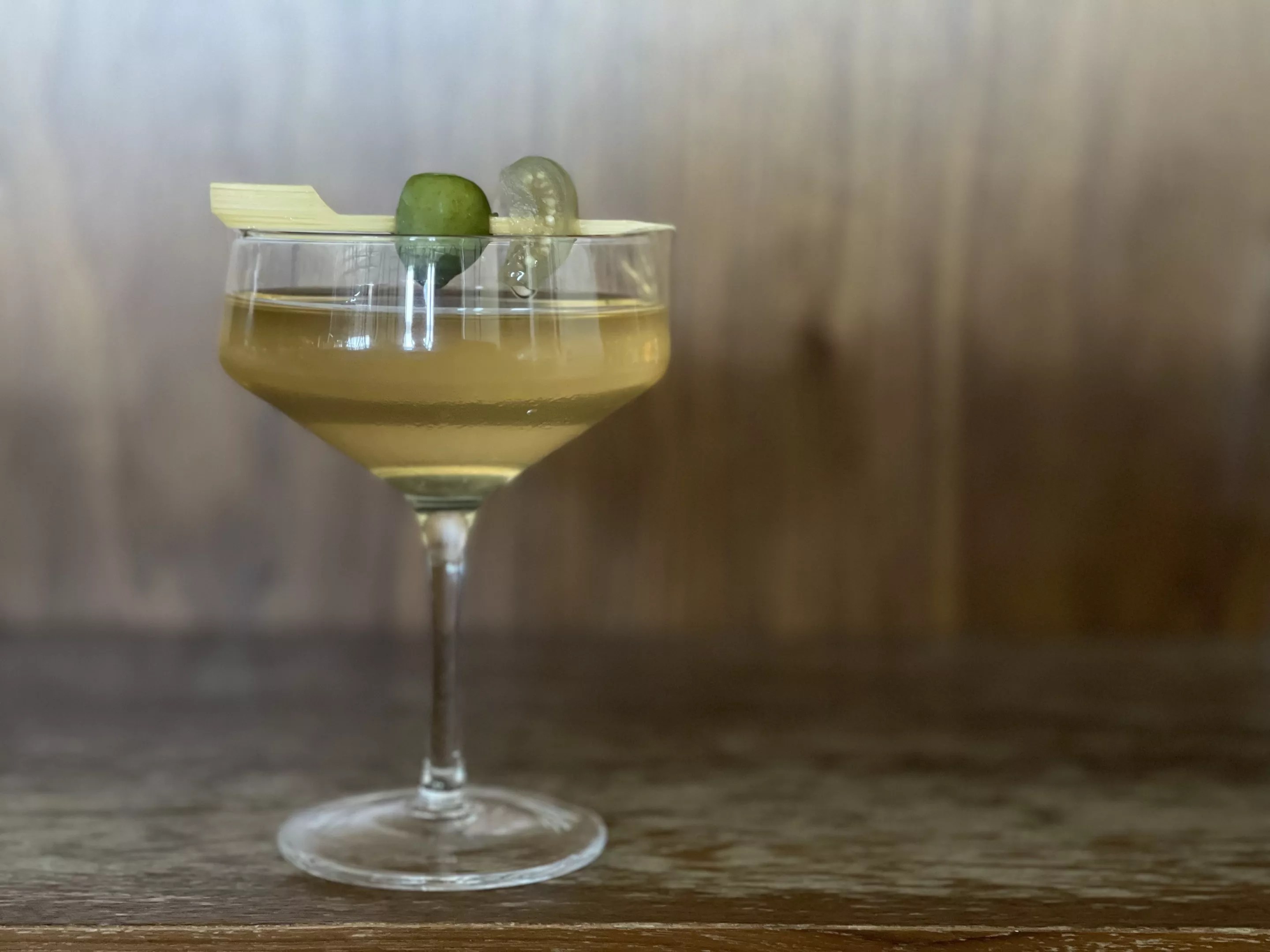 Oh, and there’s a touch of housemade dried orange bitters to boost the acid content. It’s garnished with a pitted Castelvetrano olive and pickled tomatillo.