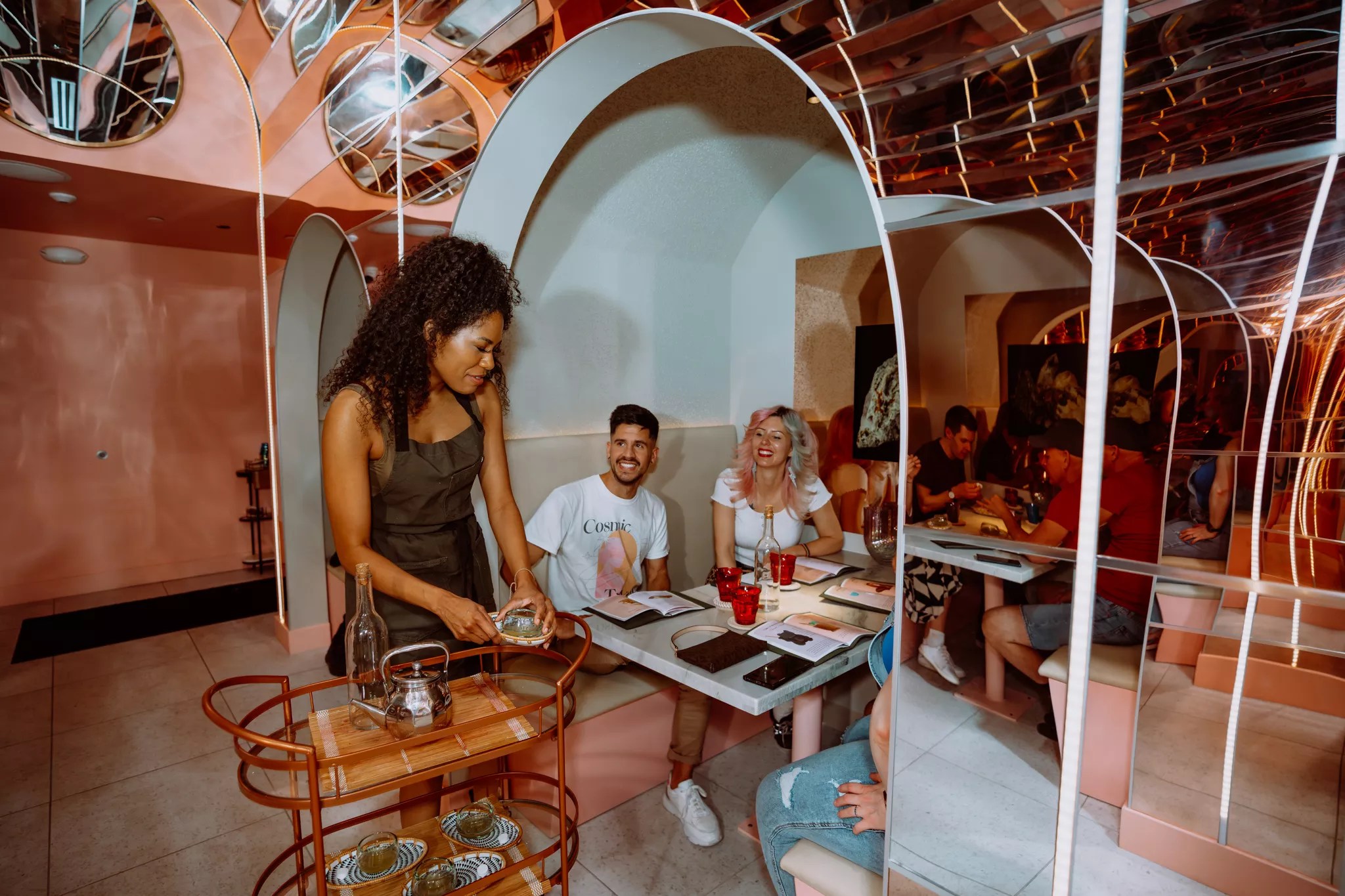 V-Day pick: Best for travel-loving couples, double datesThe Cave is a transformative experience. Hidden behind cocktail lounge Quartz, this exclusive crystal cave features an infinity-mirrored hallway with a multiverse vibe that’s both intimate and sci-fi. It radiates pink in every reflection. Take a seat in one of the 10 booths, secluded alcoves with quartz tables and pink lighting that lets you get lost in each other’s eyes, not to mention the changing crystal display projected on the tableside TV. Drinks here tell a story. Thought-provoking cocktails take their cue from deserts around the world and come in inventive vessels with exotic ingredients. Your best rose-hued bet is Life in Pink, a playful version of a pisco sour with pink peach huesillos and pink grapefruit that comes with a keepsake Peruvian friendship bracelet. Service is also a standout, matching the VIP vibe. Reservations recommended.