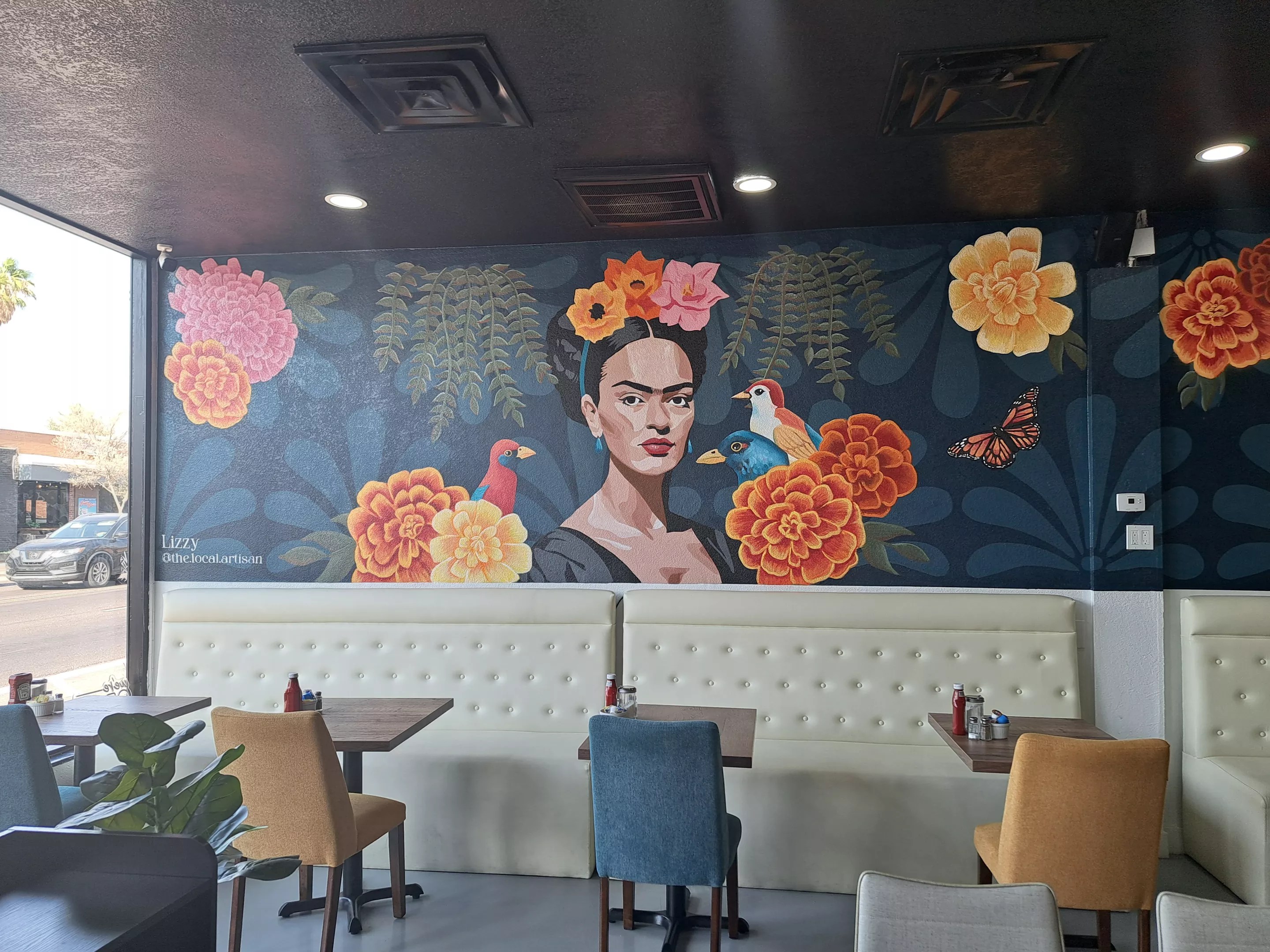 The space is colorful and inviting, with a large mural of Frida Kahlo and flower and vine-covered walls. A neon sign reads, “Life is Better When You Brunch.” Tall glass doors and windows allow an abundance of light into the bright and airy space, which is lined with white tufted banquets that surround colorful tables and chairs.