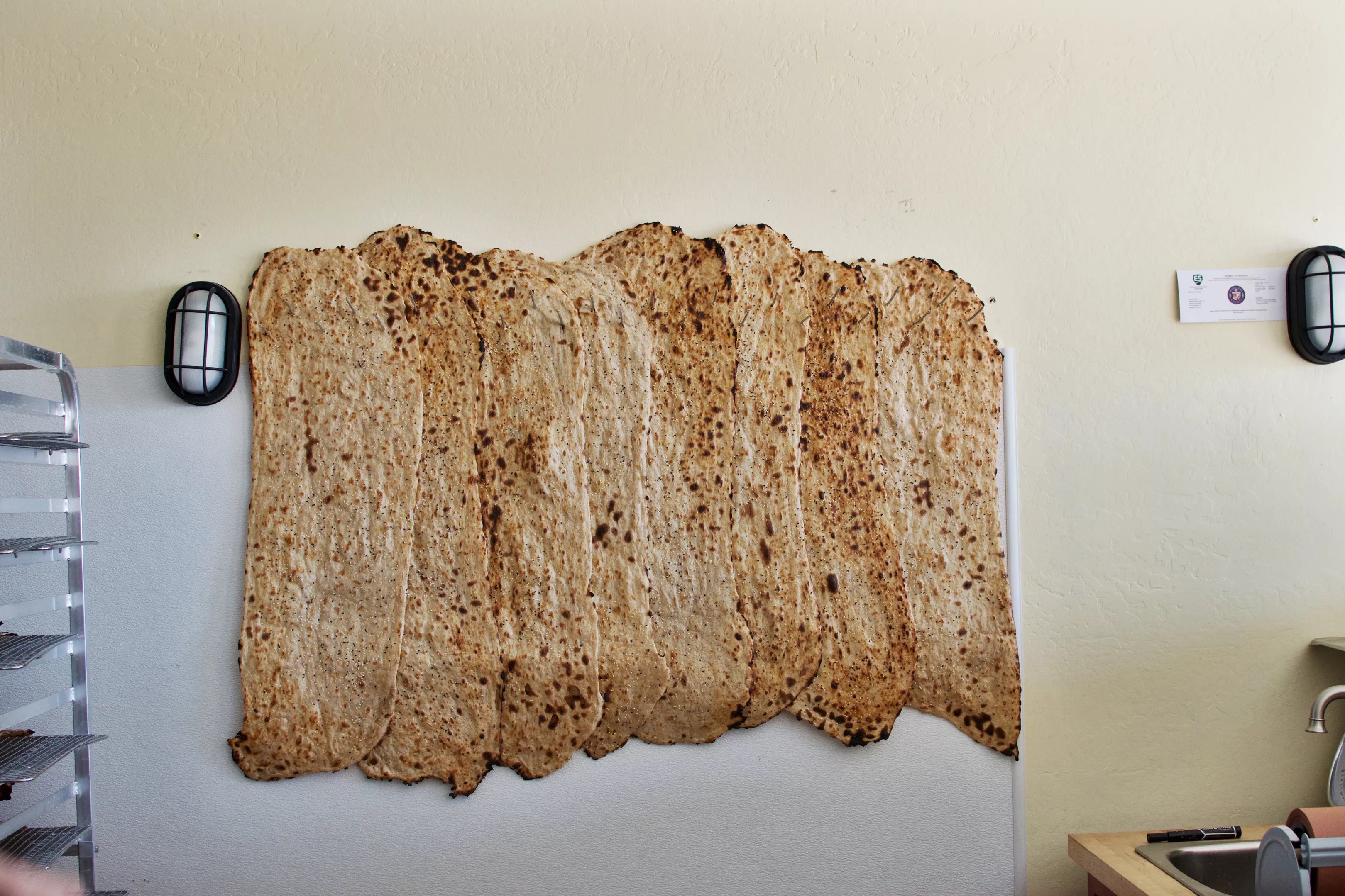 Fresh loaves of sangak bread are hung up on the wall at Saffron JAK, just like in a traditional Iranian bakery.