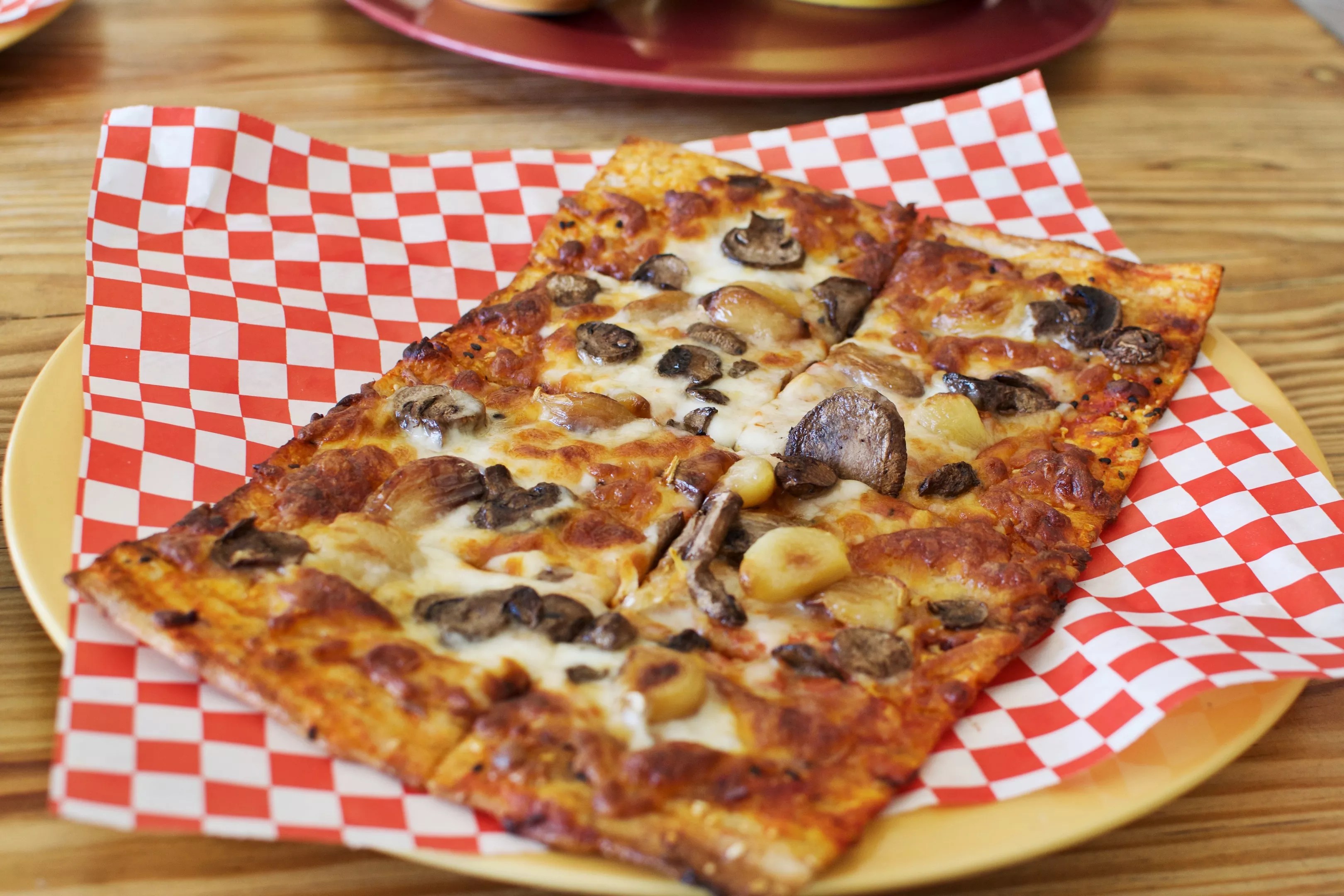 The Gram pizza at Saffron JAK is baked mushrooms and whole cloves of sweet roasted garlic on sangak bread crust.