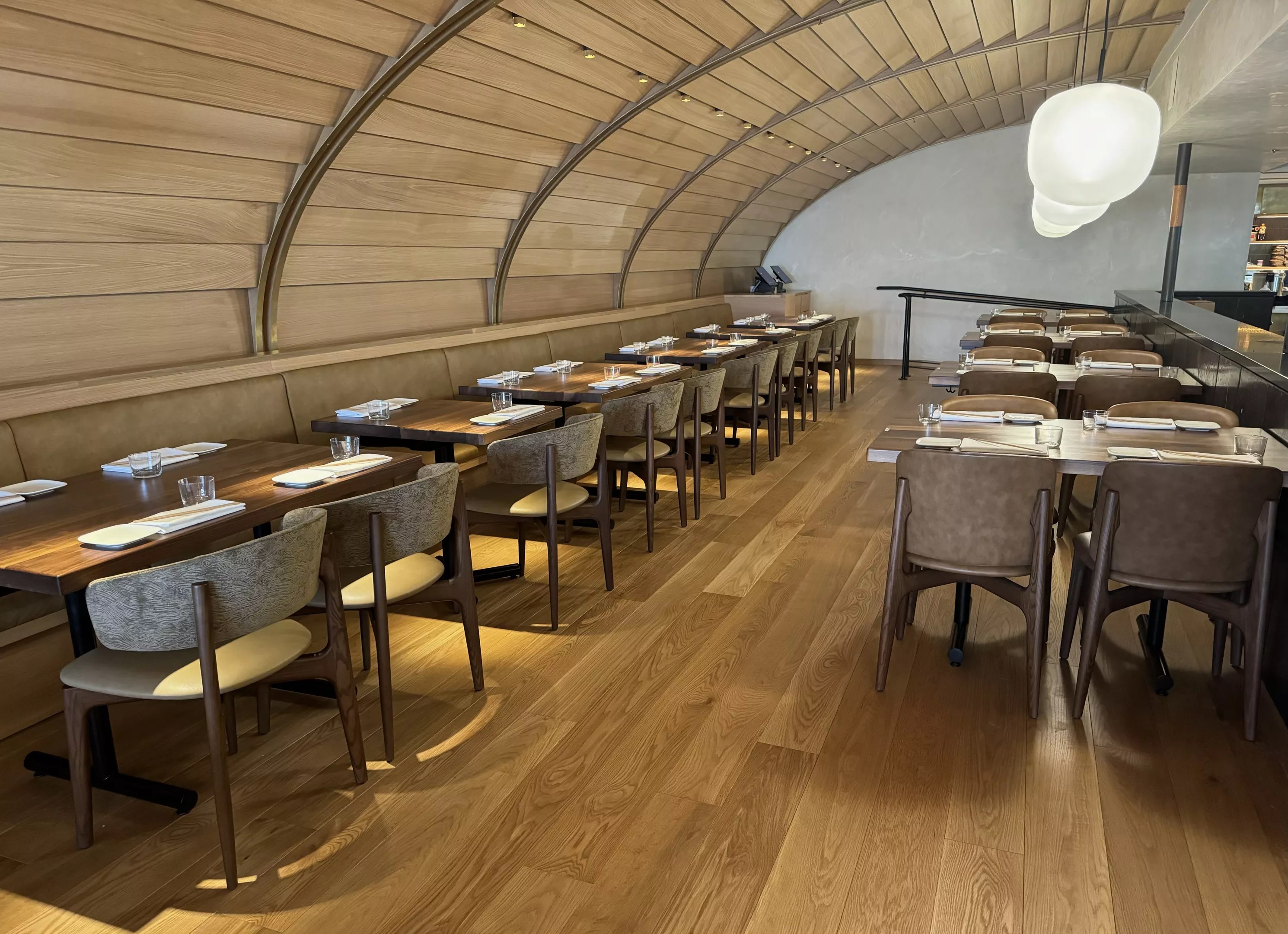 Two dining spaces, boasting arched, wood-clad ceilings, flank the interiors of Uchi in Old Town Scottsdale.