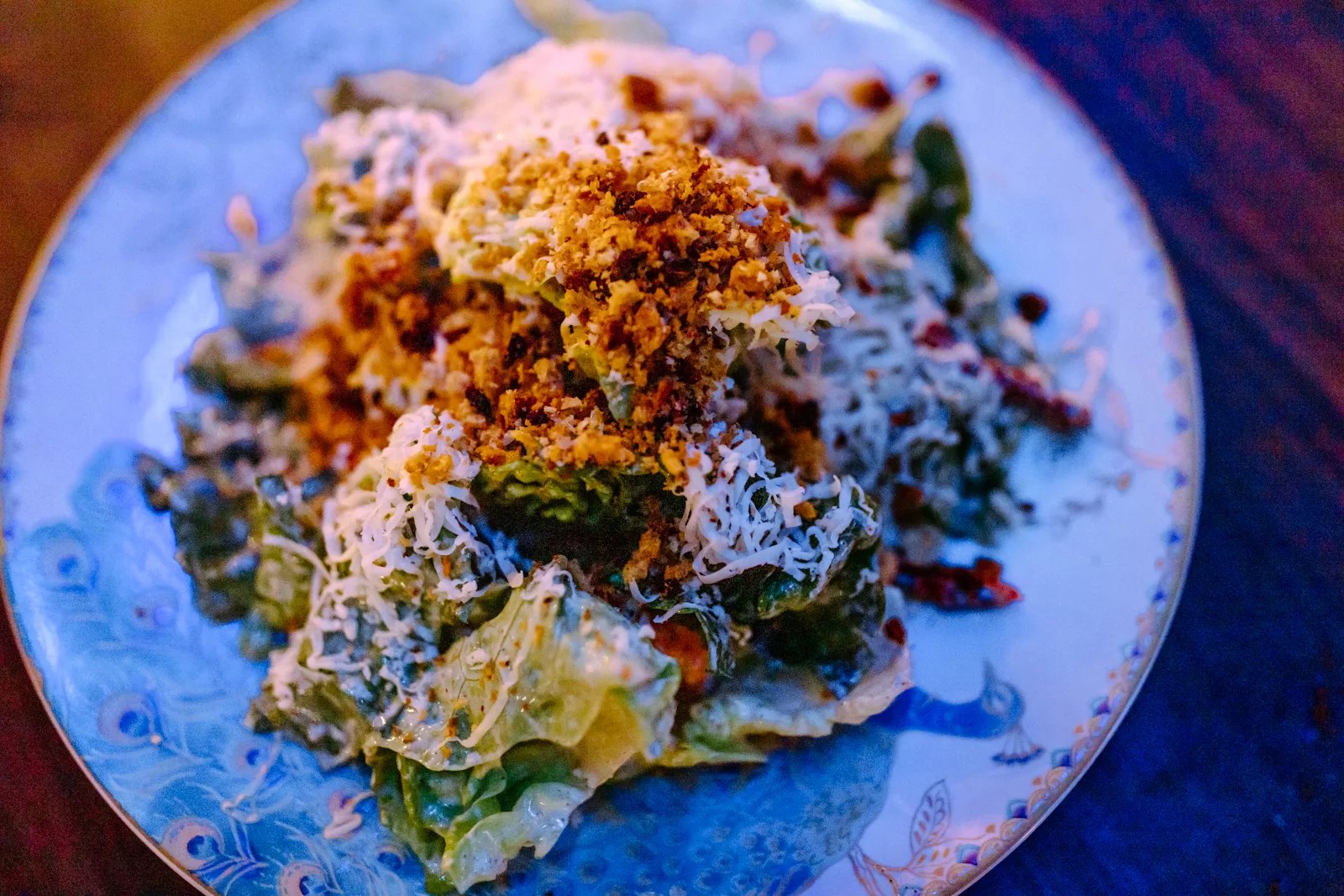 The Little Gem Caesar Salad is served on a peacock plate with a tower of lettuce, aged Manchego cheese, dried tomatoes, and toasted bread crumbs. Not overly drenched in dressing, the salad lacks flavor and it’s safe to say we could do without the hard dehydrated tomatoes. We picked those off, and decided to head elsewhere for dinner.