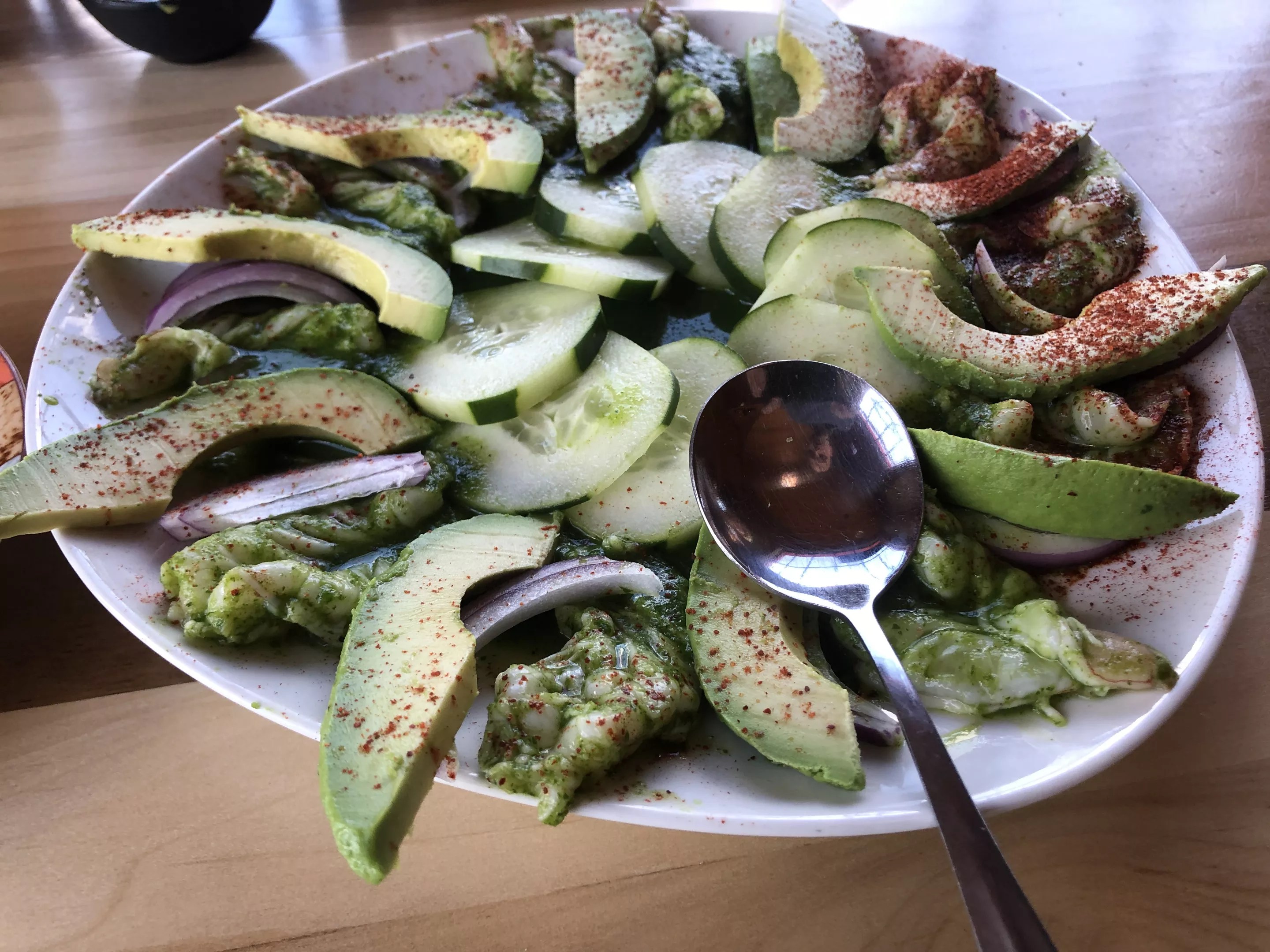Lime is heavily and nicely used in this aguachile. It appears almost like black pepper, tingling in the bright, fruity slipstream left by chiltepin. When the sun is raying and the canopies are fluttering and your shrimp is gone, it doesn’t matter who is or isn’t looking: Drink that thin, fiery marine broth!