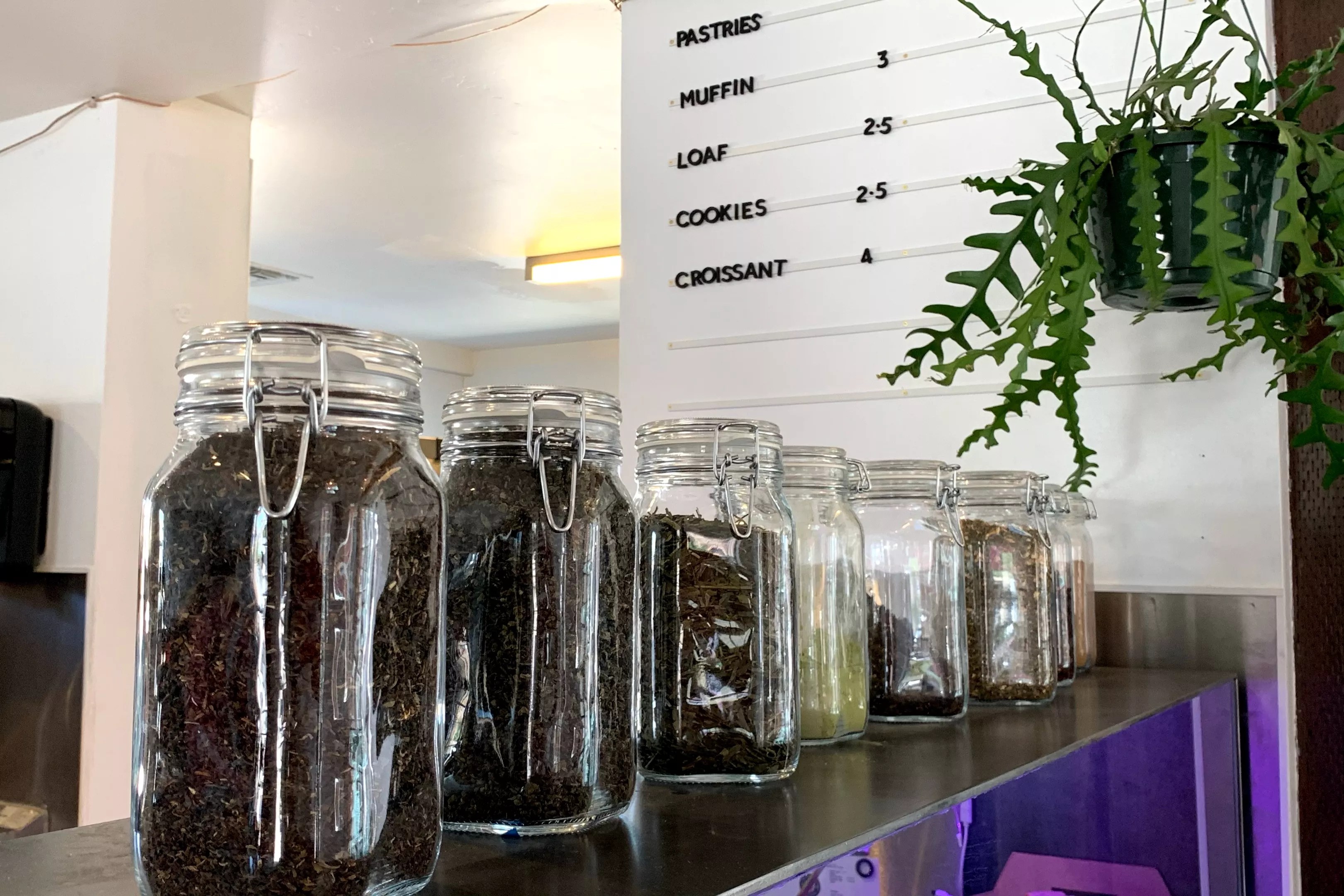 Inside Xanadu Coffee Co., jars of loose-leaf tea stand at attention on the counter. A sign reads: “Hold the tip. Our prices are all-inclusive, so we don’t accept tips. We appreciate the sentiment.”