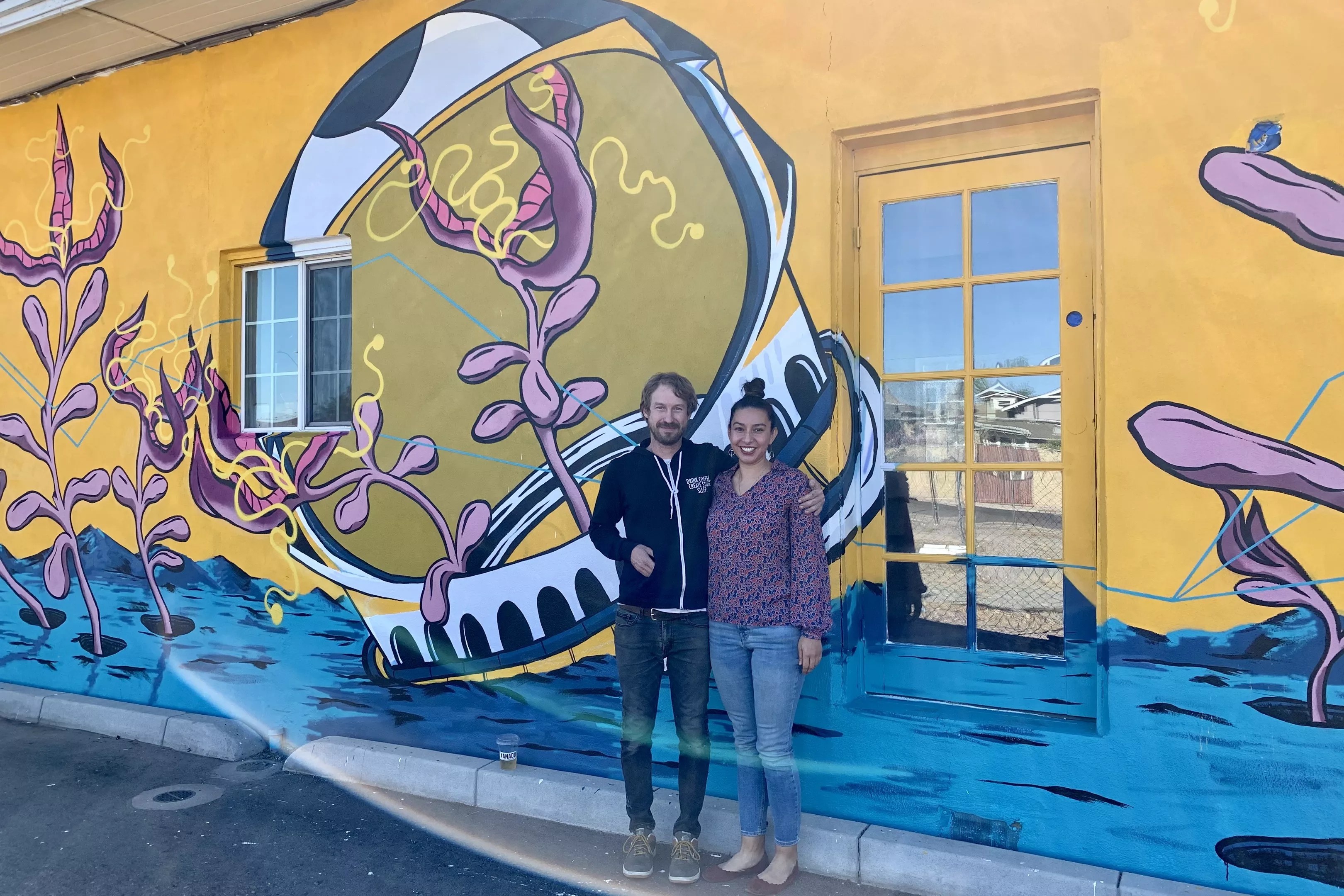 Xanadu Coffee Co. owners Randall Denton and Jessica Bueno (mural by Oscar Ruiz).