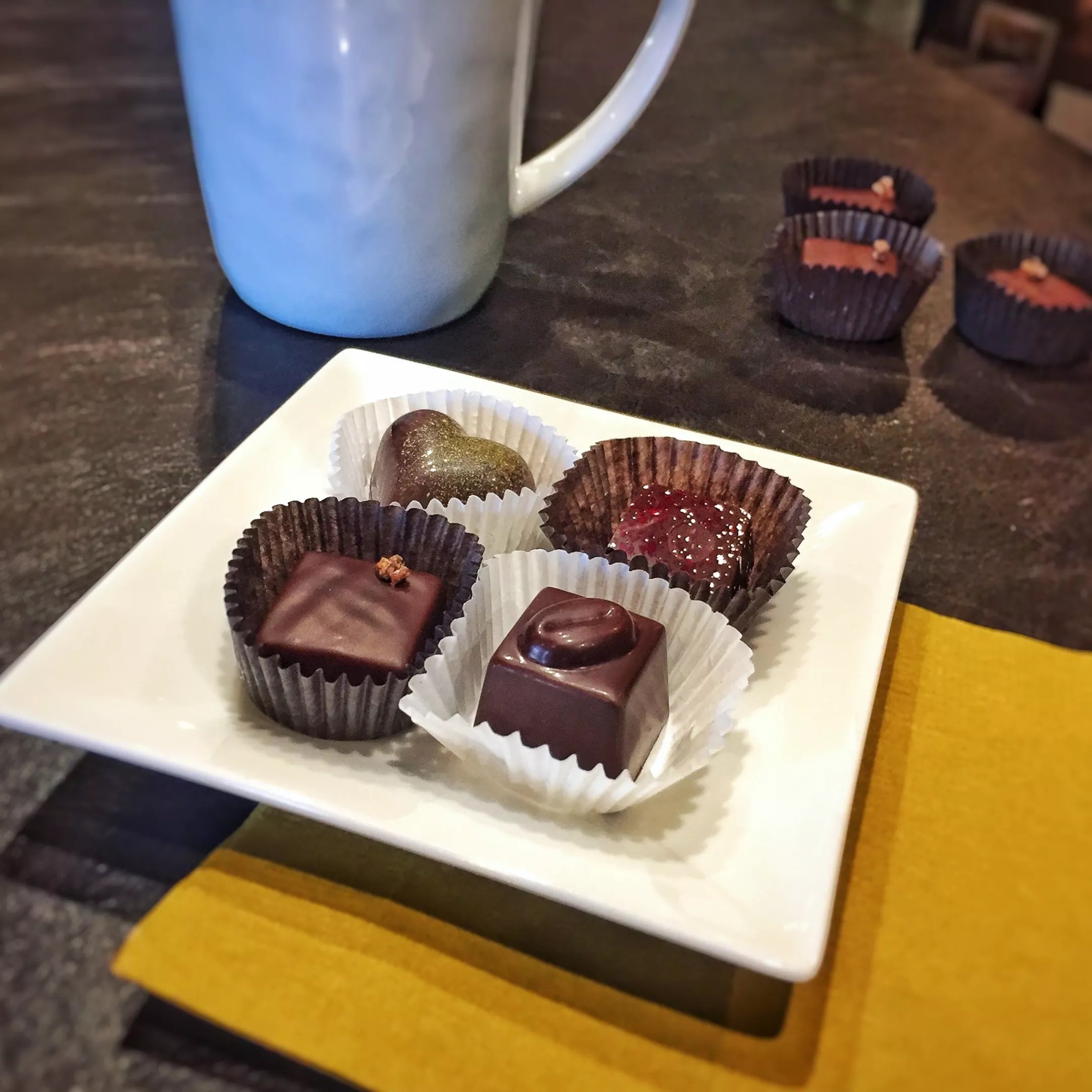 Four confections from Zak’s Chocolate, including the award-winning Cocoa Nib Caramel (front left).