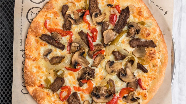 When you bite into the Steak and Blue Pizza at Fired Pie, it bites back. That would be the gorgonzola, a pungent Italian cheese made from unskimmed cow’s milk that has salty sass running through its blue veins. The way the cheese interacts with the rest of the Steak and Blue’s ingredients – garlic, oil, mozzarella, mushrooms, peppers, onion, and thin-sliced steak – doesn’t change much about its dirty-foot aroma. Against these odds, though, this pie tastes amazing. We recommend it for a solo outing, though. Maybe not great for date night.