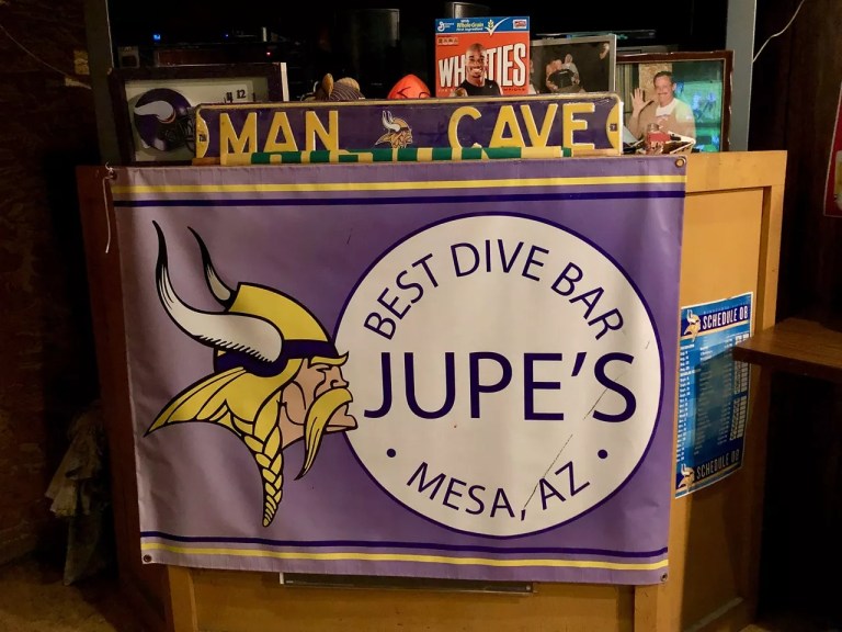 You don’t encounter many Minnesota Vikings bars in Arizona. But Jupe’s, a small, cash-only tavern open since 1982 in west Mesa, is a sea of purple on NFL Sundays, owing to a lineage in bar ownership that stretches back to Fargo, North Dakota. Inside, the bar’s all patchwork wood paneling, period-specific beer signs, framed 8-by-10s of the bar’s big drinkers, and, of course, Vikings memorabilia. It’s easy to find a regular to chat with or watch groups of friends having a good time playing songs from the internet jukebox. There’s also a pool table, a smattering of high-top tables and chairs, and often some warming nacho cheese at the potluck tables. To drink? Keep it simple: beers, mixed drinks, maybe a Jell-O shot.