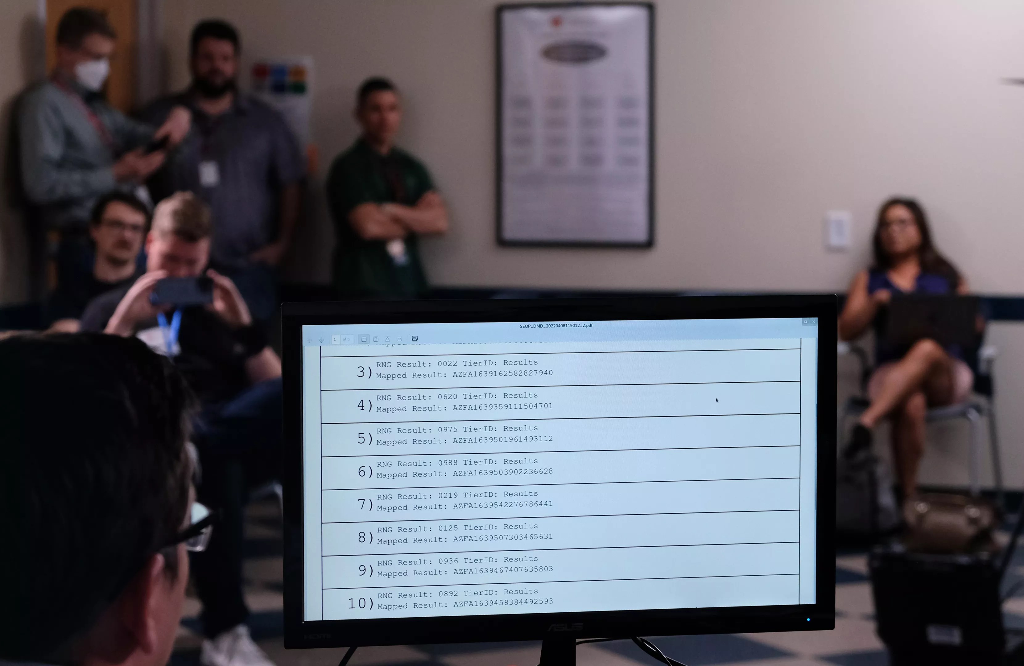 Independent auditors ready the lottery system at the headquarters of the Arizona Department of Health Services.