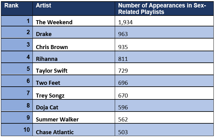Abel Tesfaye, more commonly known as The Weeknd, was far and away the top featured artist on sex-related playlists. His tracks showed up 1,934 times, almost 1,000 times more than Drake, who second on the list with 963 appearances.