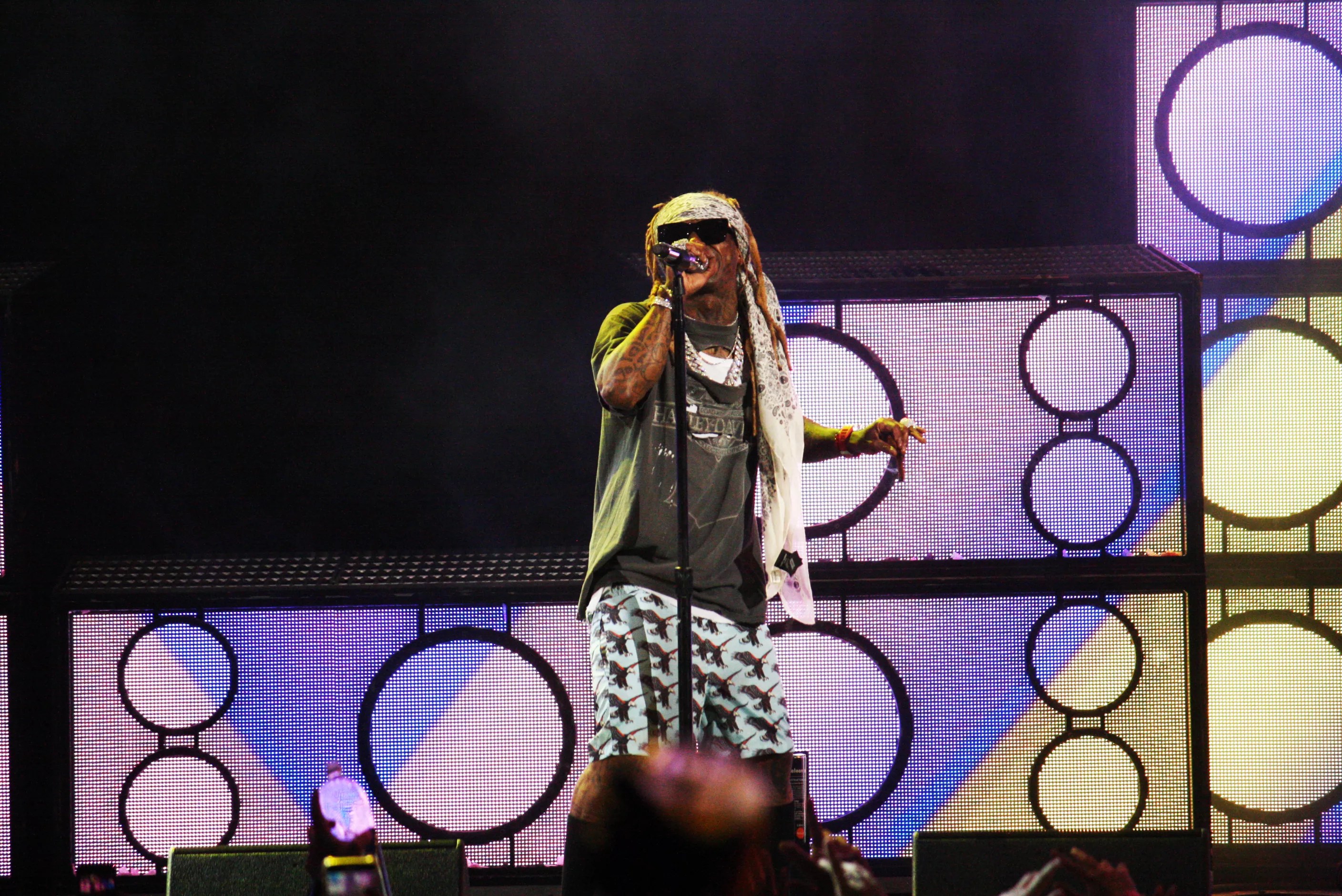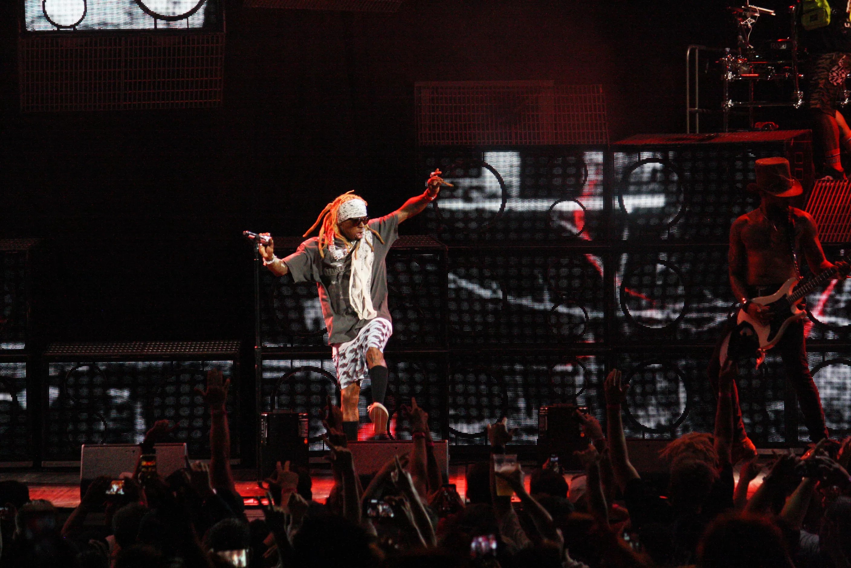 Weezy performed with a full band: bass, drums, keys, a DJ, and a shirtless guitarist in a top hat who looked like LeBron James doing Mad Hatter cosplay. Rows of fake speakers and cabinets towered behind him and hung from the ceiling; his drummer, keys player, and DJ performed on elevated stages behind Wayne while he was flanked by his two guitar players. Thank the gods old and new, Wayne did not strap one of the guitars on himself and give us any Young Money shredding. He left the sweet-licking and riffing to the professionals.