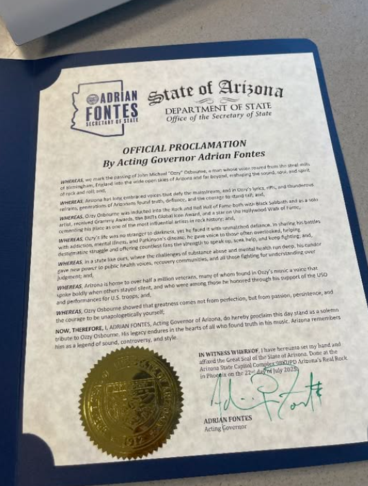 Serving as Acting Governor, Arizona’s Secretary of State Adrian Fontes affixed the seal and signed the proclamation at 98KUPD Official, citing reasons beyond Osbourne’s music career to honor his legacy.