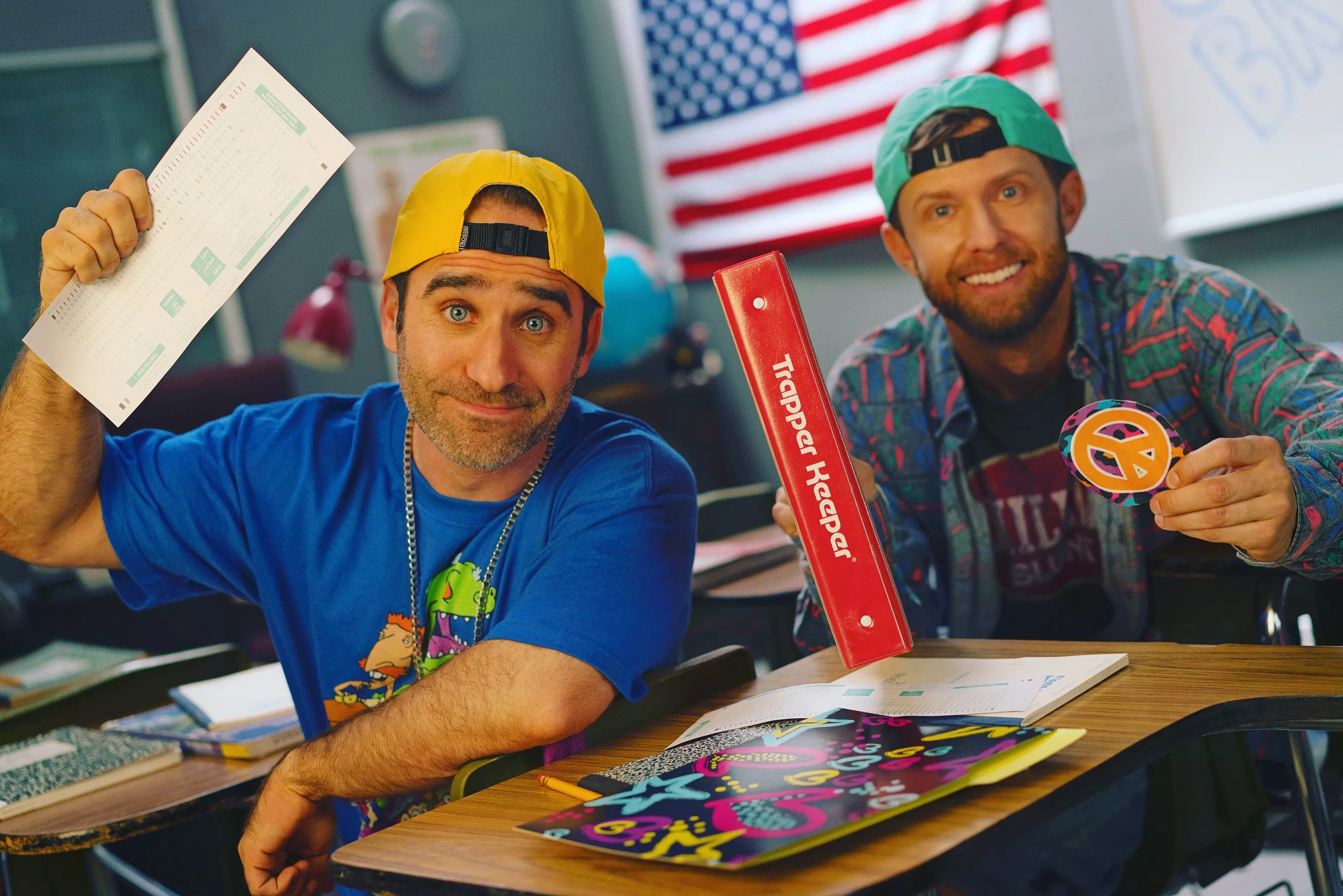 It starts with a young boy riding a self-balancing scooter up to a neighborhood garage sale. When Giroux and Jensen try to sell him a Walkman, he looks at it like it just landed from another planet. The duo nod to each other, and the beat starts as they pull in the screen to a standard definition aspect ratio. That’s when you realize they aren’t messing around when it comes to their ’90s knowledge.