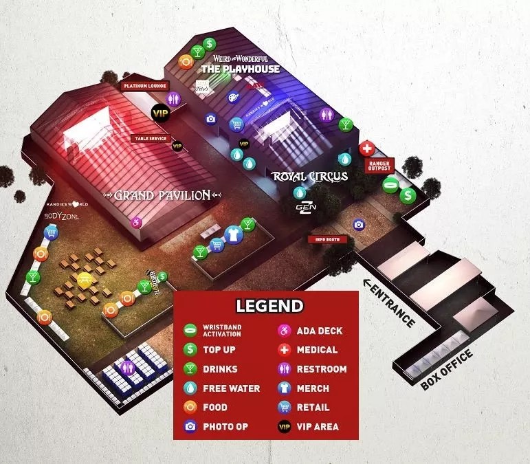What will the festival’s layout be like? The Grand Pavilion stage will be located in the Rawhide Event Center building with vendors, picnic tables, and outdoor bars situated along the adjacent Sonoran Lawn. Meanwhile, the Royal Circus stage and The Playhouse area (which will host the “Weird & Wonderful” performers) will be north of the event center.
