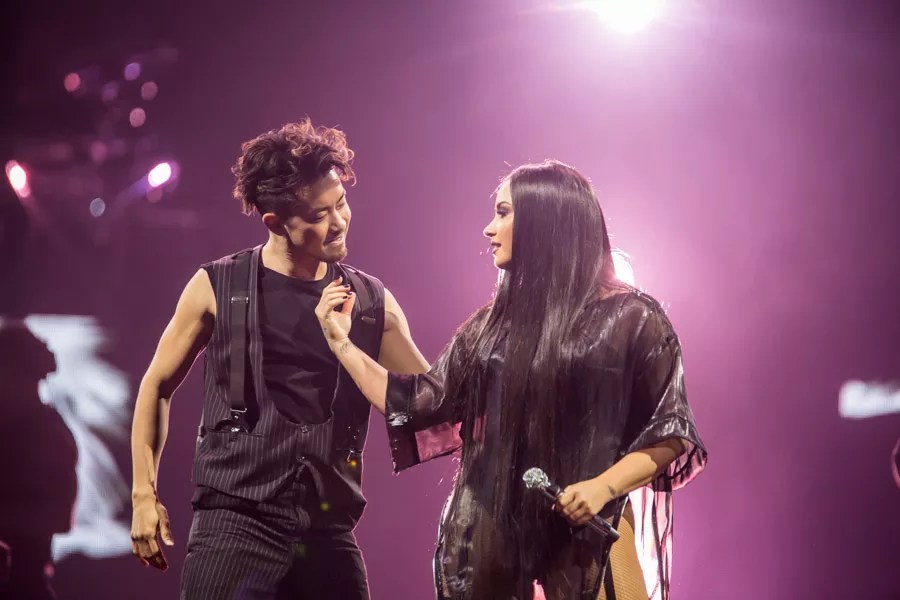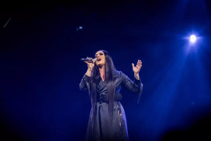 Lovato rose from a hole in the floor in a getup that looked like a cross between a black dress and a trench coat. She sang “You Don’t Do It for Me Anymore” alone onstage. Her voice was loud and clear, while her presence and technique are impressive.