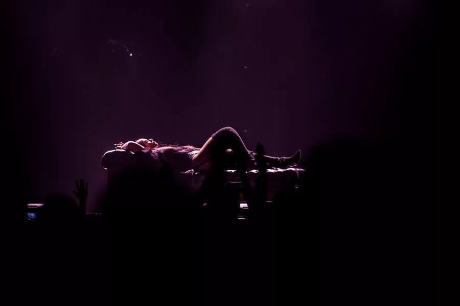 This wouldn’t be the only time the crowd got to play “Where In The World Is Demi Lovato?” The singer would later disappear and re-emerge on a rotating bed on the other side of the arena. Holding a guitar, she sang “Cry Baby” while lounging on white sheets.