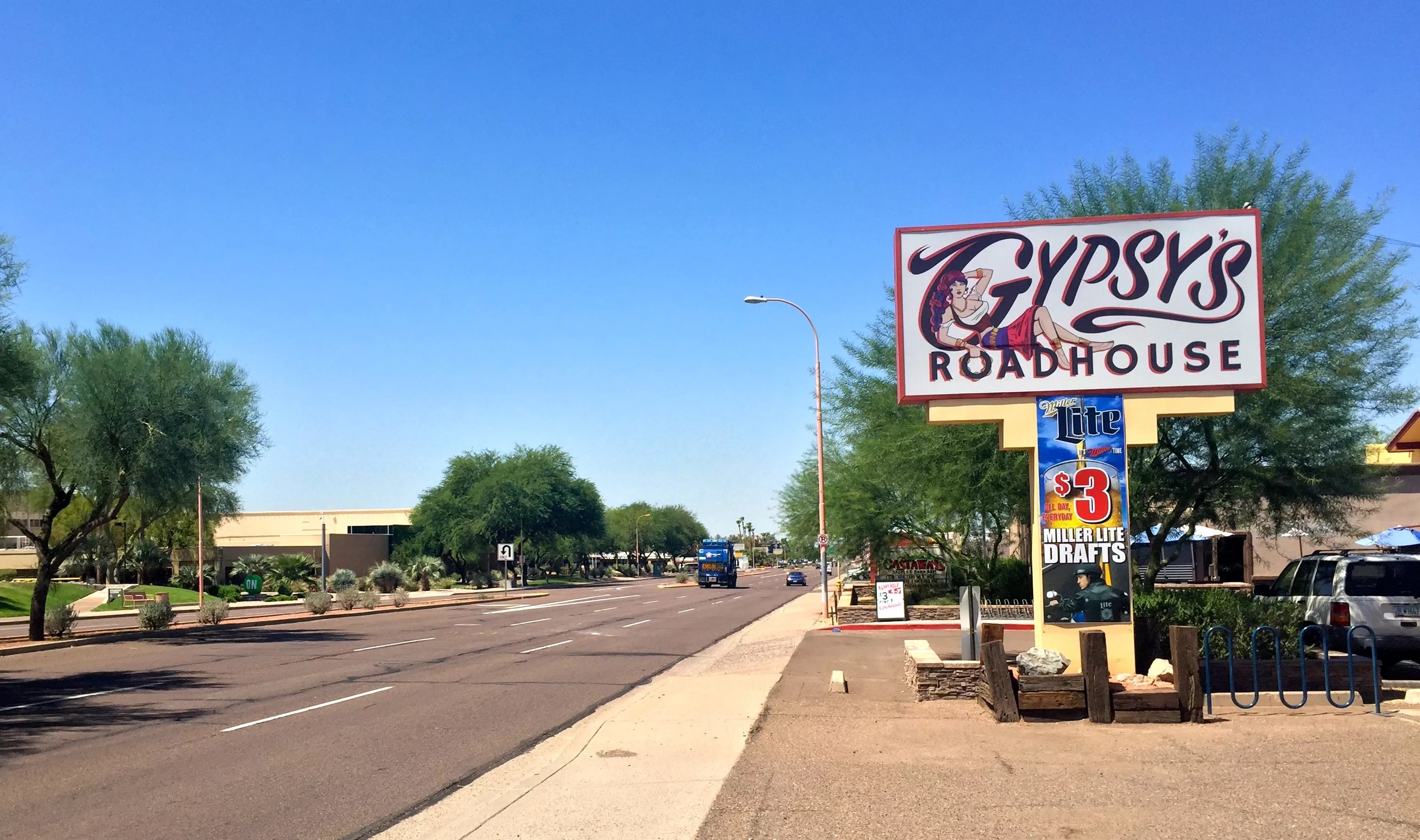 Formerly The Lark, Baja Red’s Cantina, and Daisy Duke’s (and back-dropped by Papago Park), this biker-themed bar was once packed with Motorola employees, and referred to as the “Building L” of the complex that once existed across the street during the Lark days. Now, Gypsy’s Roadhouse has a full menu, darts, karaoke, live music, and free pool on Monday and Tuesday. Best thing about this place: Retirees call their section of the bar “Heaven’s Waiting Room.” Wisconsin native and 30-year regular Rich Pollack will let you know, “I only drink alone or when I’m with somebody.”