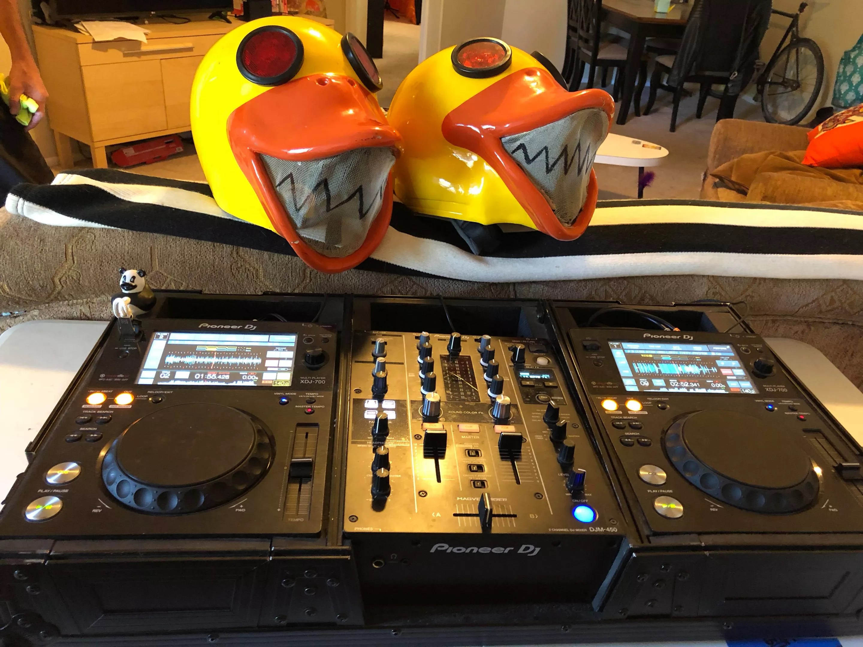Our live setup consists of Pioneer XDJ-700 decks with a DJM-450 mixer with Rekordbox, so we don’t have to rely on a computer to run our show. Hardware is much more reliable for us than software, and you don’t have to worry about a laptop overheating or crashing.