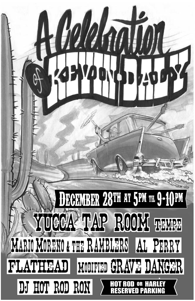 John Logan (Thee Madcaps ): I met Kevin Daly in the Fall of 1998, after moving to the Phoenix metro area from Tucson. I was playing my first show with Curse of the Pink Hearse in Tempe. No practice, letting it fly. Afterwards, this guy I didn’t know came up the stairs at Cannery Row to the stage and said, “That was amazing! Can I get a picture with you?” and he pulled out a disposable camera and snapped a pic. We started talking about gear, music and people. He introduced himself as playing for Grave Danger, who we were opening for that night. He then played a smoking set. I asked afterward, “Do you know my friend Al Perry?” Al had mentioned a couple of friends of his in Phoenix when I told him I was moving up here. Of course, he did know Al well. They seemed like similar types of characters, both playing a screaming Telecaster, both had a very independently distinctive style of Americana music, and both were equally kind, genuinely authentic people.
