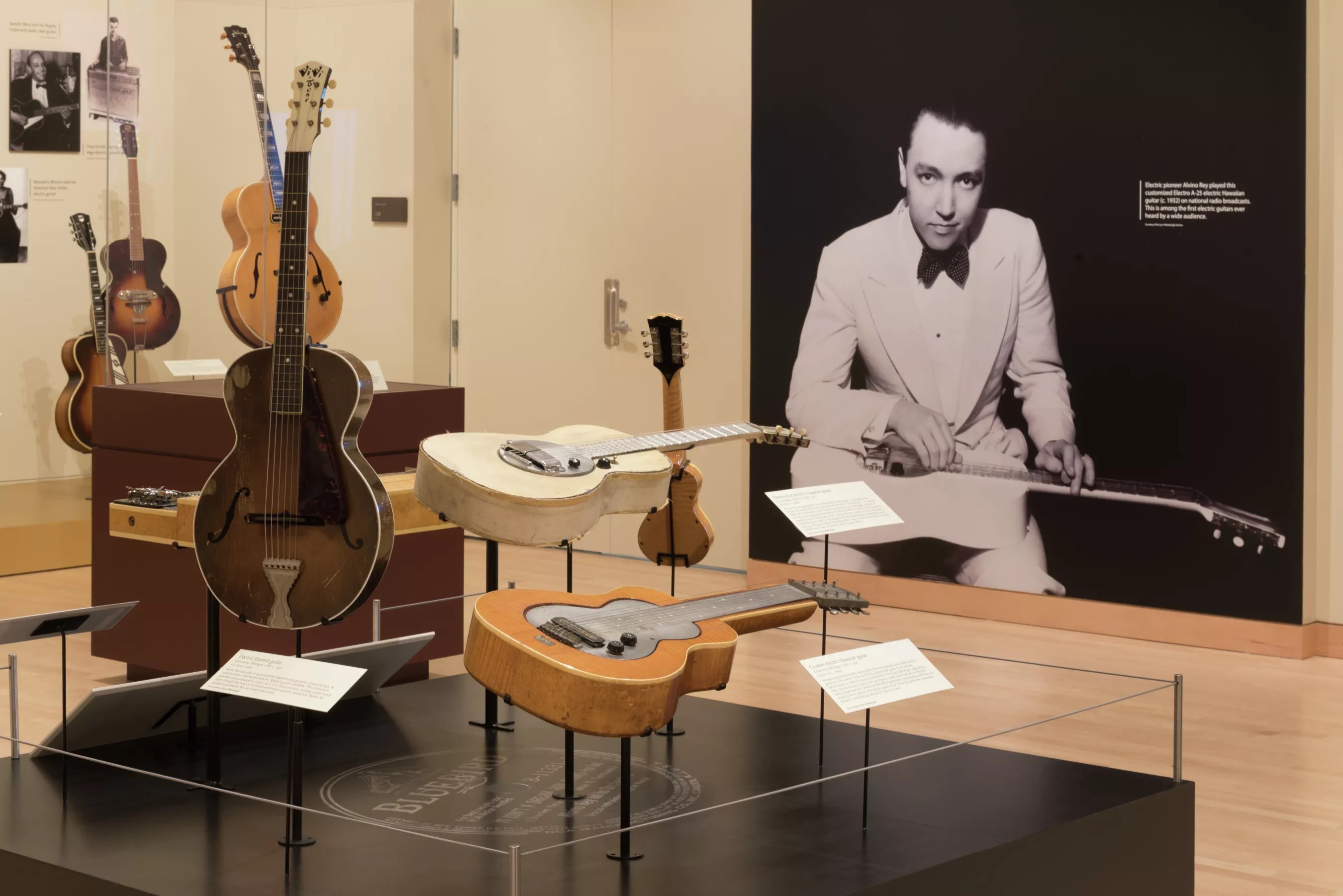 The exhibit includes more than 80 electric guitars and amplifiers, including frying-pan guitars, pedal steel guitars, and double-neck guitars. Several were built during the 1930s and 1940s, an era