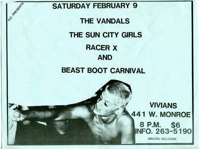 Big History: “It’s one of my earliest shows [in Phoenix]. Jim Andreas of No Volcano was looking for people to jam and asked me if I wanted to meet there. The second time I went there, it was for Fugazi, which drew maybe 1,500 people, which was unheard of back then. I’m an Illinois boy, and I could tell friends in Chicago I saw T.S.O.L. and The Vandals.”