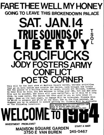 Young and Dumb: “This is the show [January 14, 1984] that stands out most for me, and one of the last at Madison Square. It featured T.S.O.L., JFA, Conflict, Crucifucks, and Poets Corner. I was maybe 15 at the time, and it was maybe my fourth or fifth concert. And we’d ridden with some older guys, and this was [their] home base for shows at the time. It totally blew my mind.”