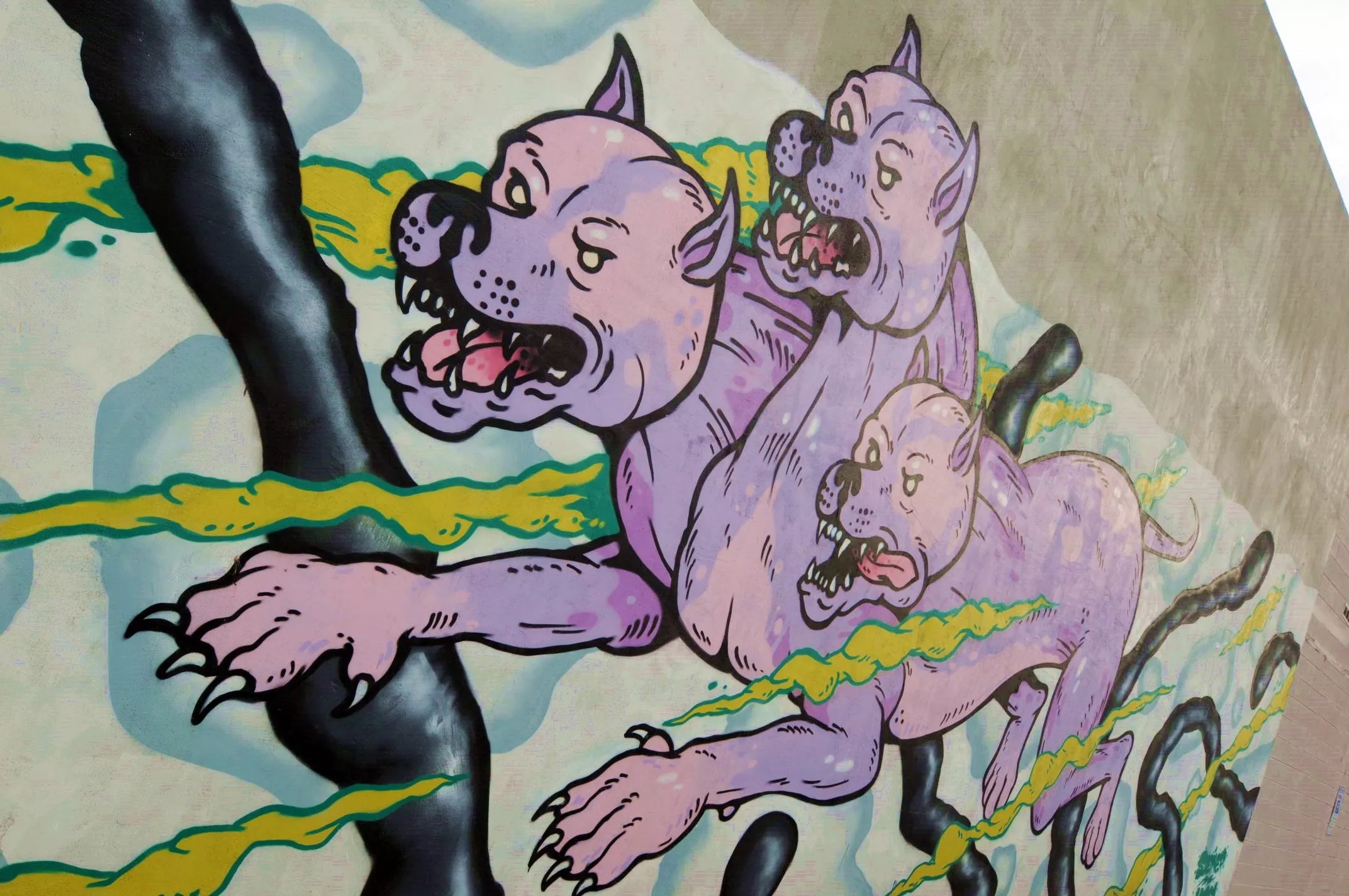A colorful mural of Cerberus decorating the parking lot of Gracie’s Tax Bar.
