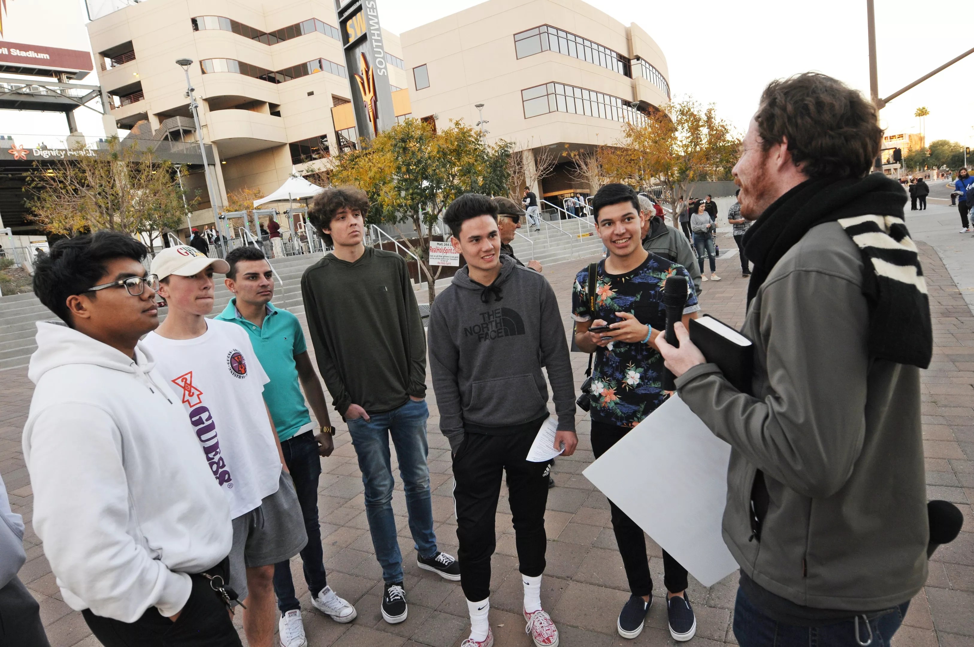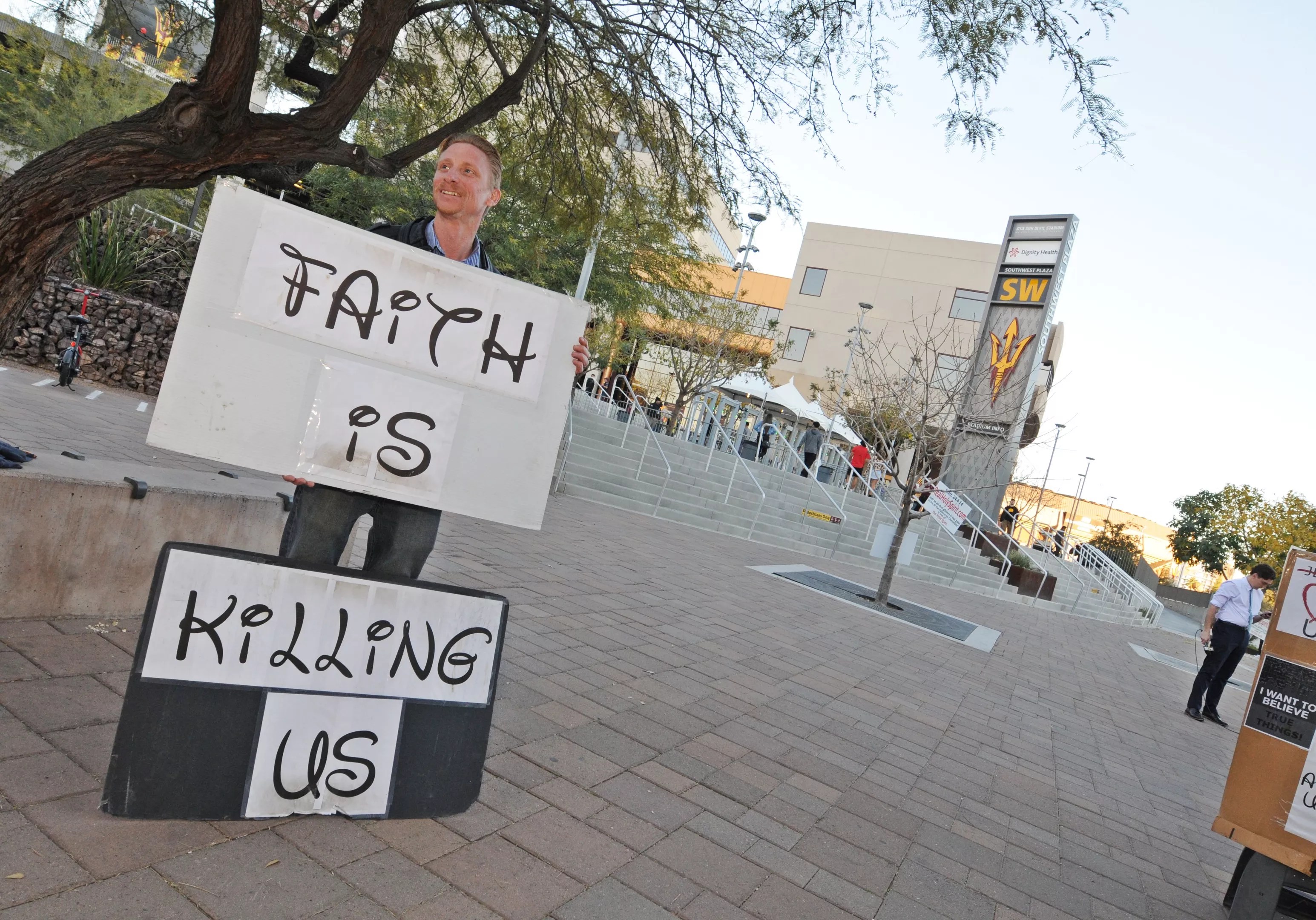 A street preacher speaks with attendees of Awaken 2020 outside of Sun Devil Stadium in Tempe.
