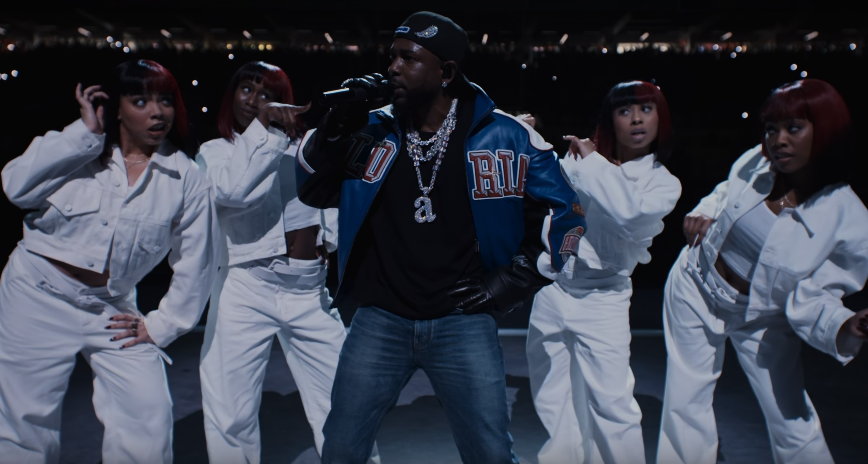 “This is the great American game,” Jackson said, as the cameras panned to the stage, which appeared as a giant tic-tac-toe board. After “Uncle Sam” introduced the performance, a spotlight illuminated the Compton-born rapper sitting on the hood of a Buick Grand National GNX, a nod to his latest album, GNX. Another reference to the album could be seen on a patch sewed onto Lamar’s jacket, which read Gloria, as he kicked off the set with an unreleased track fans know as “Bodies” before going into his latest hit, “Squabble Up.”
