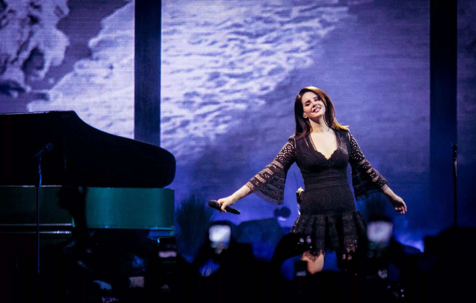 Dressed in black and flanked by two backup dancers, Del Rey opened with “13 Beaches.” Her voice filled the room as she prowled from one side of the stage to the other. The crowd near the stage jostled and churned to get closer to her. At one point, it looked like a mosh pit for cameraphones.
