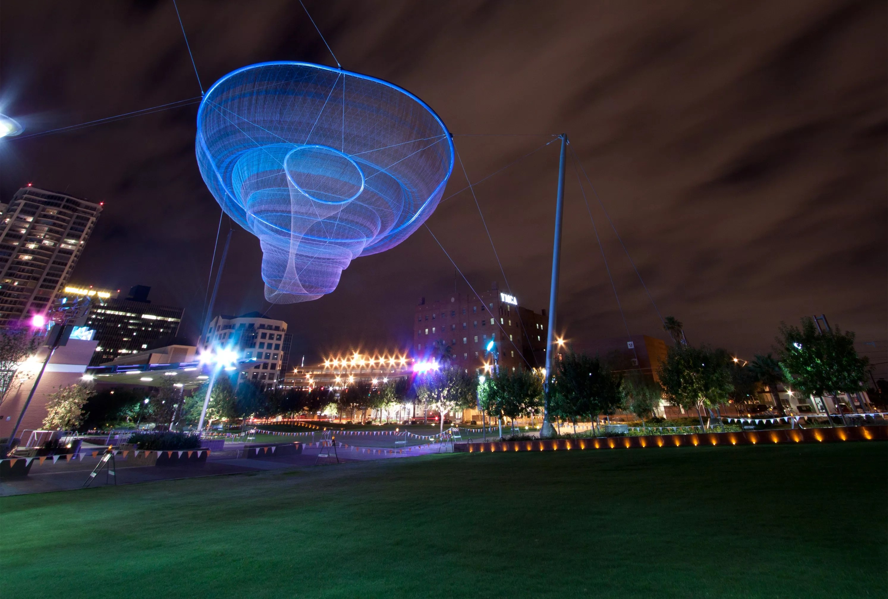 Janet Echelman’s aerial sculpture “Her Secret is Patience” at Civic Space Park in downtown Phoenix.