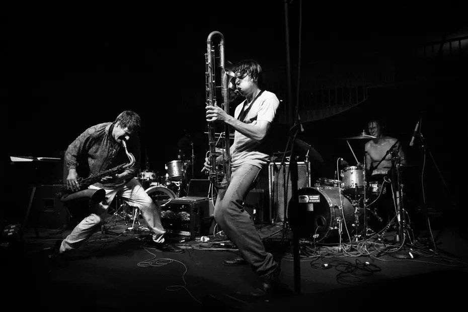 Moon Hooch, a three-piece band that fuses electronic music and jazz with two saxophones and a drum set, got their start busking on subway platforms in New York City around 2010. Over the past few years, the act has changed from street to stage and toured through bars and clubs around the U.S., all while incorporating more electronic elements into its acoustic foundations.