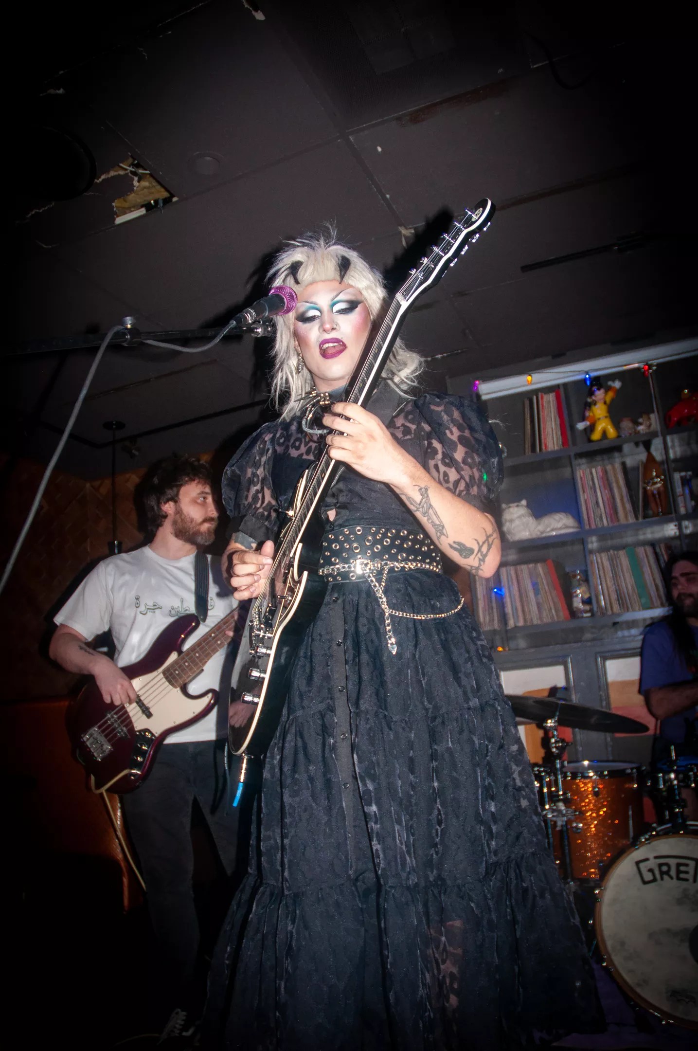 After the first drag set concluded, Astrud and her band delivered an unexpectedly psychedelic performance featuring completely original tunes. While the set itself only featured “a few songs,” each track easily eclipsed a radio edit’s running time. Astrud glided her hands up and down the neck of the guitars like someone classically trained, and clearly strived for aural perfection in the songwriting and sound departments. The gritty texture of Astrud’s voice, which had the character of a fanfare trumpet, struck out in specific directions, yet was never overpowered by the instrumentals. Guitarist Calin Gross complements Astrud’s parts with some bad-ass solos, with Brandon Biallis on bass and Spencer Ferrarin on drums giving us some slithery rhythm and percussion.