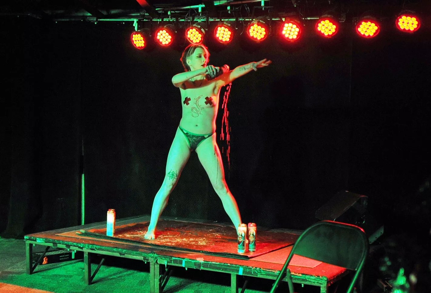 Burlesque artist Kinky Kirra incorporated a staple gun into her performance. Ouch.