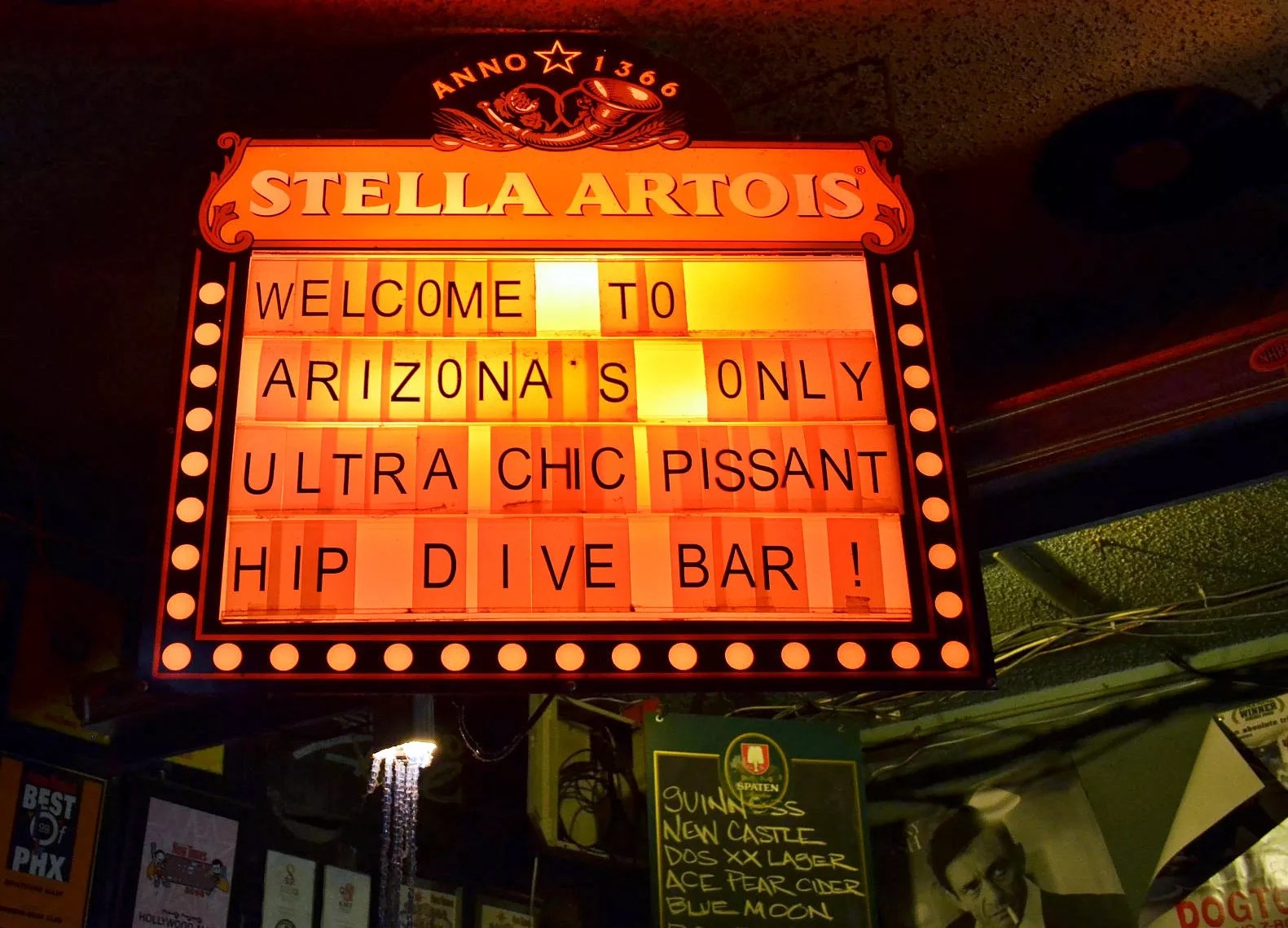 Adorned with thrift-store decor and exuding a low-brow vibe, the bar lived up to its slogan, “Arizona’s only ultra-chic pissant hip dive bar.” Hollywood Alley’s true claim to fame was as a legendary Arizona music venue, hosting countless bands and performers. Its musical repast was diverse (ranging from blues and funk to indie and Americana), and its history includes visits and gigs by some of the biggest names in local music.