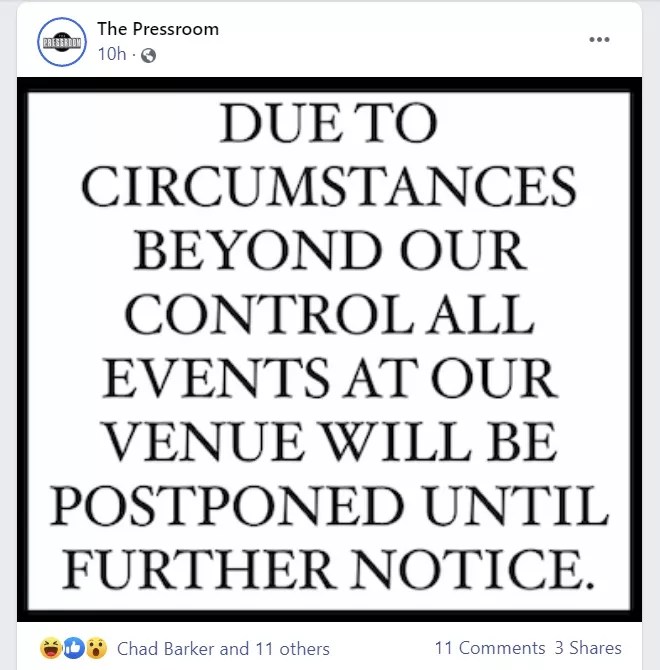 An image posted to the Pressroom’s Facebook on Wednesday night, which was deleted the following day, stated all upcoming events at the venue have been postponed for the time being “due to circumstances beyond our control.”