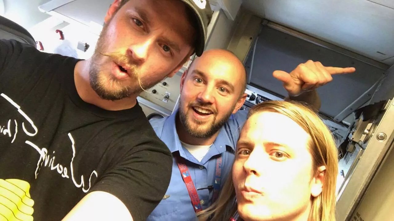 Sundressed’s Forrest Waldorf and Trevor Hedges take a selfie with flight attendant Oliver Smith after their in-flight performance.