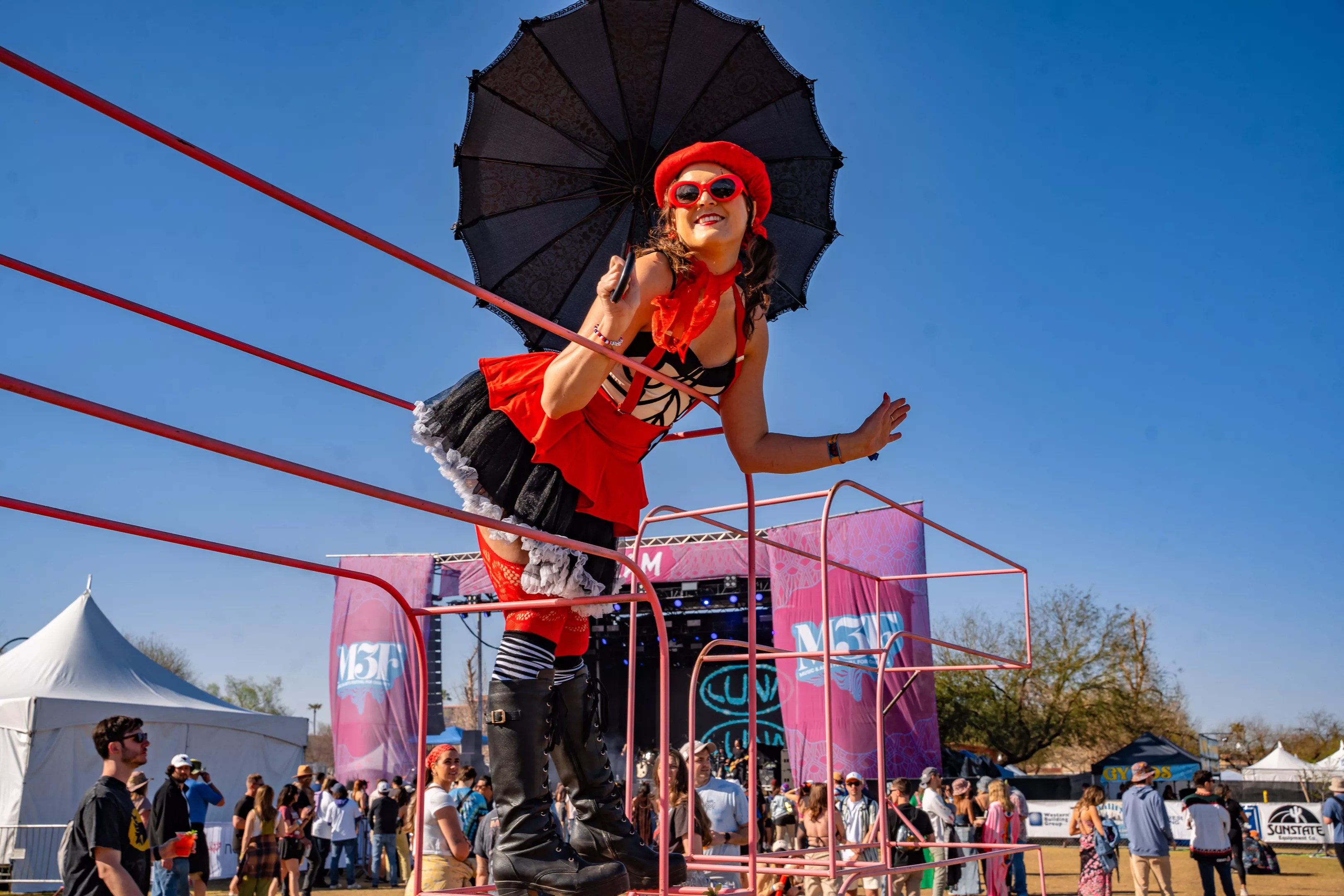 I’m not fully entrenched in the culture of electronic music, and so I don’t really get the whole dressing up aspect of fests like M3F. Wouldn’t you be happier/more comfortable in a hoodie and hat then, say, assless chaps and a duck head? But this year, it felt like, be it a response to the rain or something else, people really brought their A games in the costume department. Whether it’s the dude with neon hair that “turned on” via his glowing umbrella, the many jumpsuits (so much utility in those bad boys) or lots of flowy capes and scarves, this year’s ensembles were wild but thoughtful. It’s nice to see people express themselves but also consider the more community-oriented vibes of M3F, and that balance is how M3F feels so diverse and multifaceted. If nothing else, at least there wasn’t anyone in a satirical Elon Musk costume. A fan poses during day two of M3F Fest 2025. Mike Bengoechea