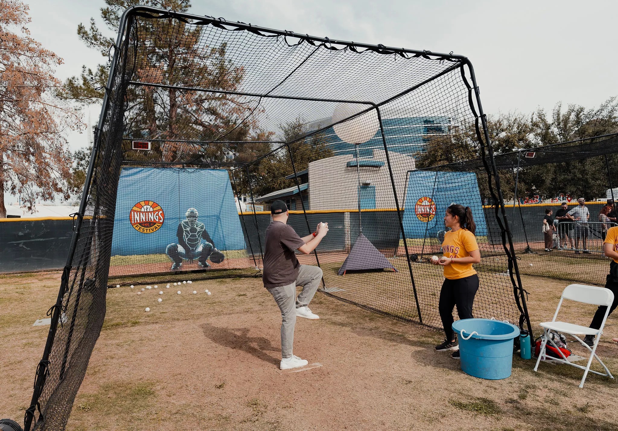 Everyone has their own way of having fun at a music festival, and for some people, that includes drugs. We’re not going to judge, but we were happy to see a tent at Innings Festival offering free naloxone to Innings Festival attendees. Naloxone, a medication approved by the Food and Drug Administration, is designed to rapidly reverse opioid overdoses. We didn’t hear of anyone needing to use it at the festival, but we know several attendees took the opportunity to grab some to have on hand in the future, the better to keep everyone safe. JG Innings Festival attendees take some pitching practice. Neil Schwartz Photography