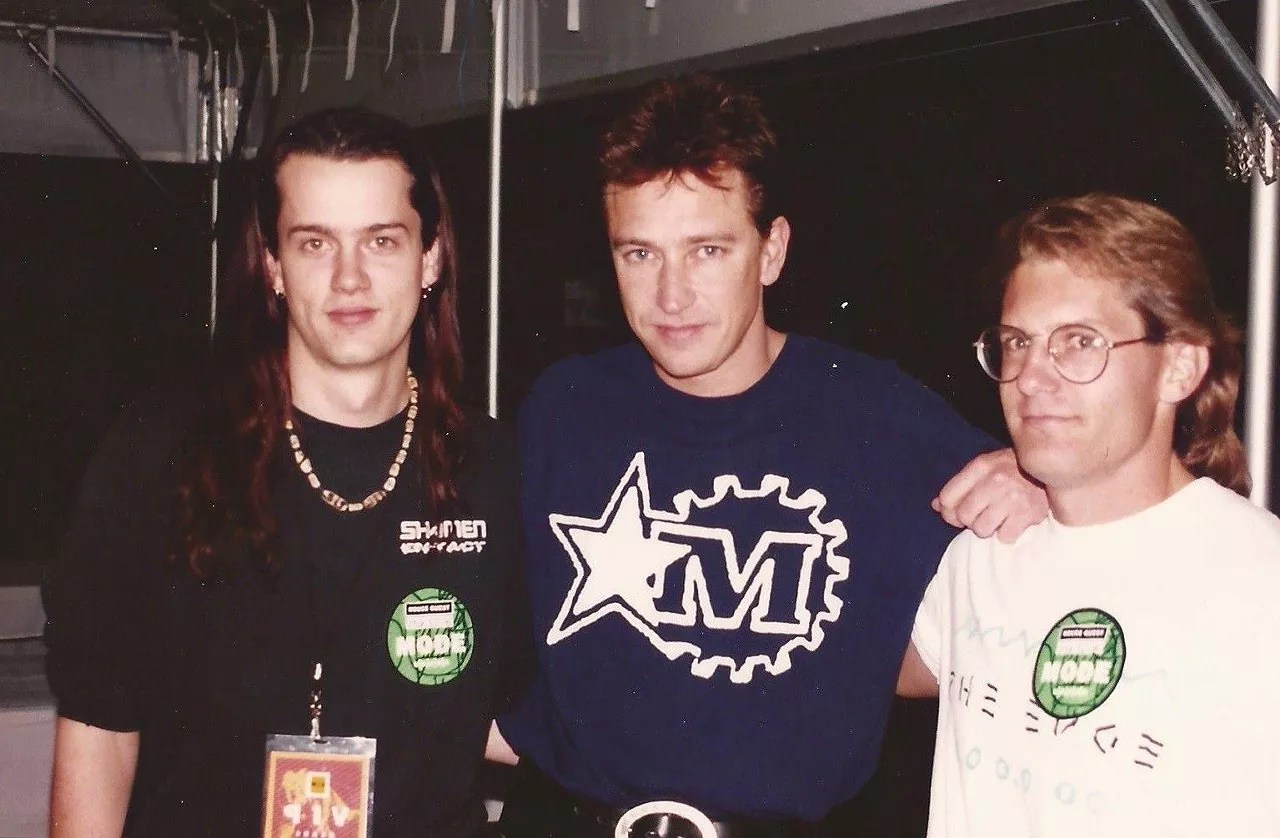 The Edge’s Christopher the Minister (left) and Gregg Paul (right) with Depeche Mode’s Andy Wilder in 1994.