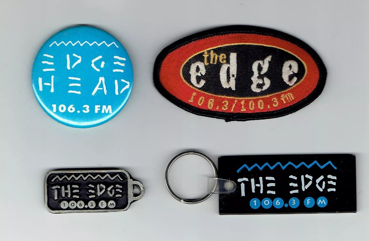 Keychains and other branded mementos from various eras of The Edge during its 19-year run from 1993 to 2012.