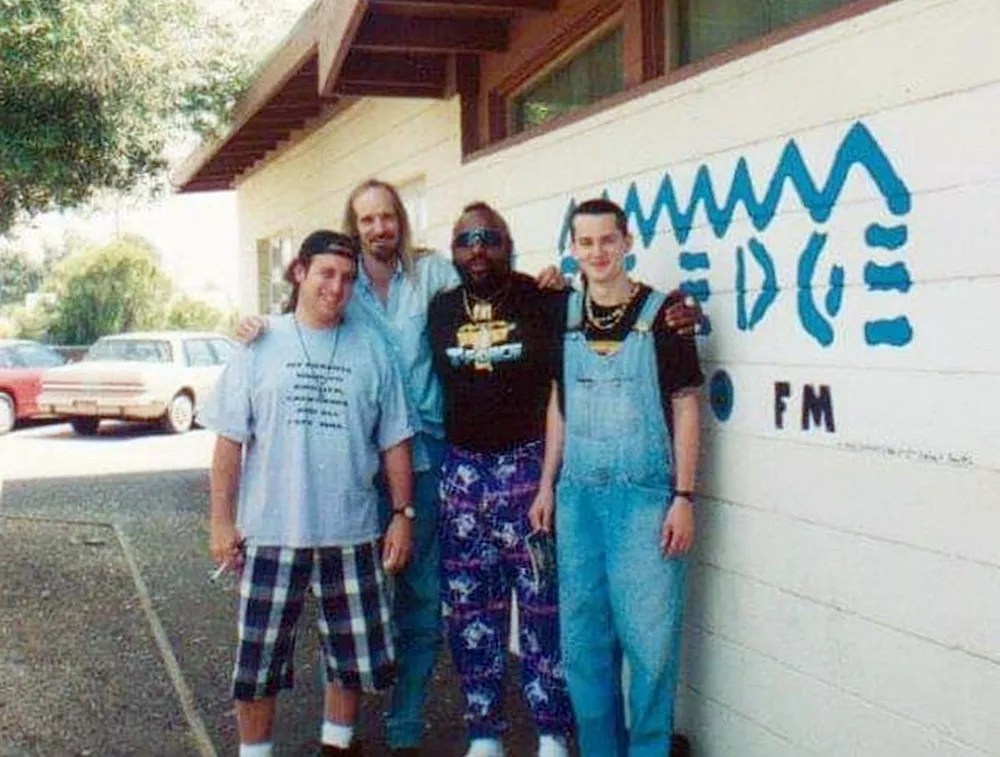 Mr. T (center right) poses with on-air talents Willobee (far left) and Dead Air Dave (center left) outside of The Edge’s original studio near 75th Avenue and Camelback Road in the early ’90s.