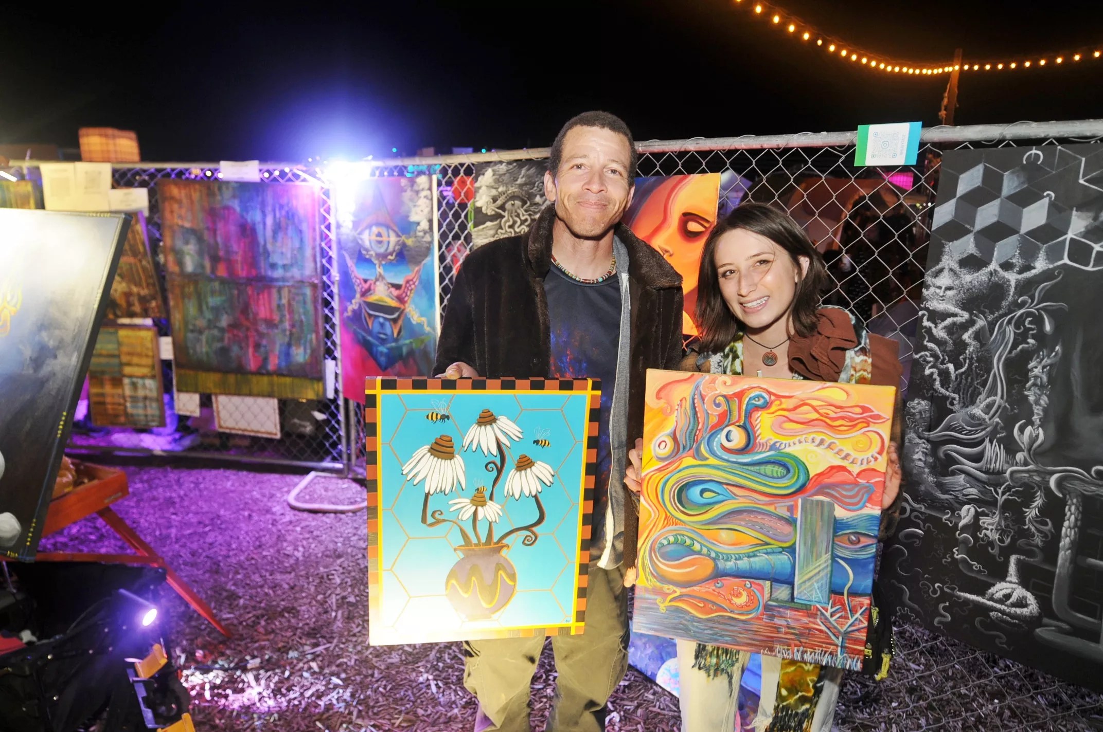 Local artists Doug Calhoun (left) and Daryn Viser (right) traded paintings with each other at Full Moon Festival: Wolf Moon. Calhoun got Viser’s work “Honeycomb Flowers” and she received his painting “I Got New Shoes.”