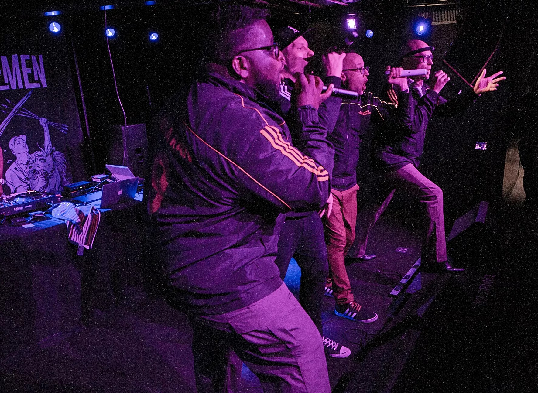 Phoenix geek rapper Mega Ran, center left, with MC Lars, center right, MC Frontalot, right, and Schaffer The Darklord onstage at The Rebel Lounge in September 2021.