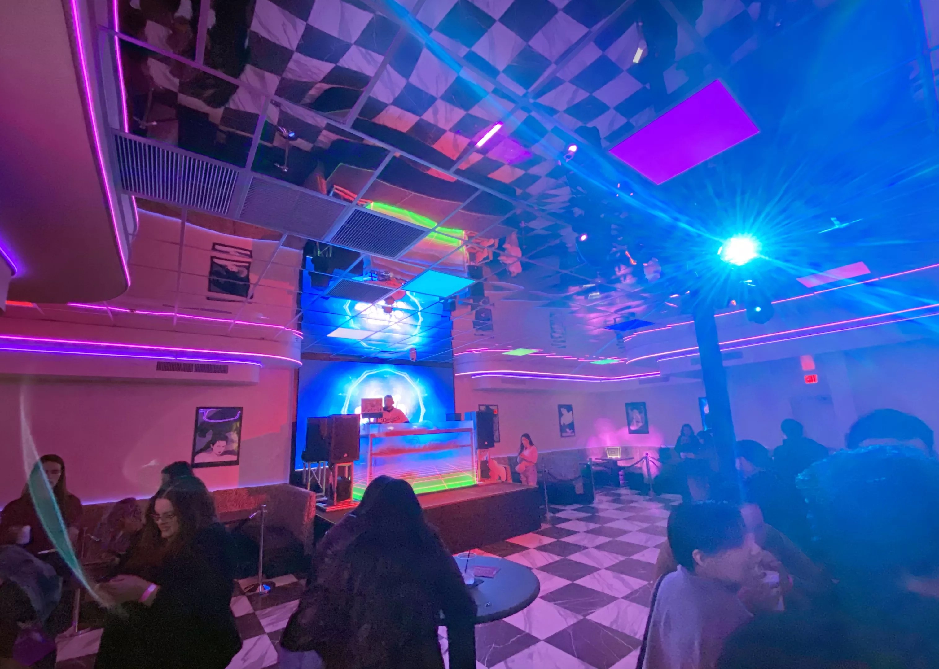 Thundercat Lounge’s main room features a large black and white checkered dance floor and neon lighting.