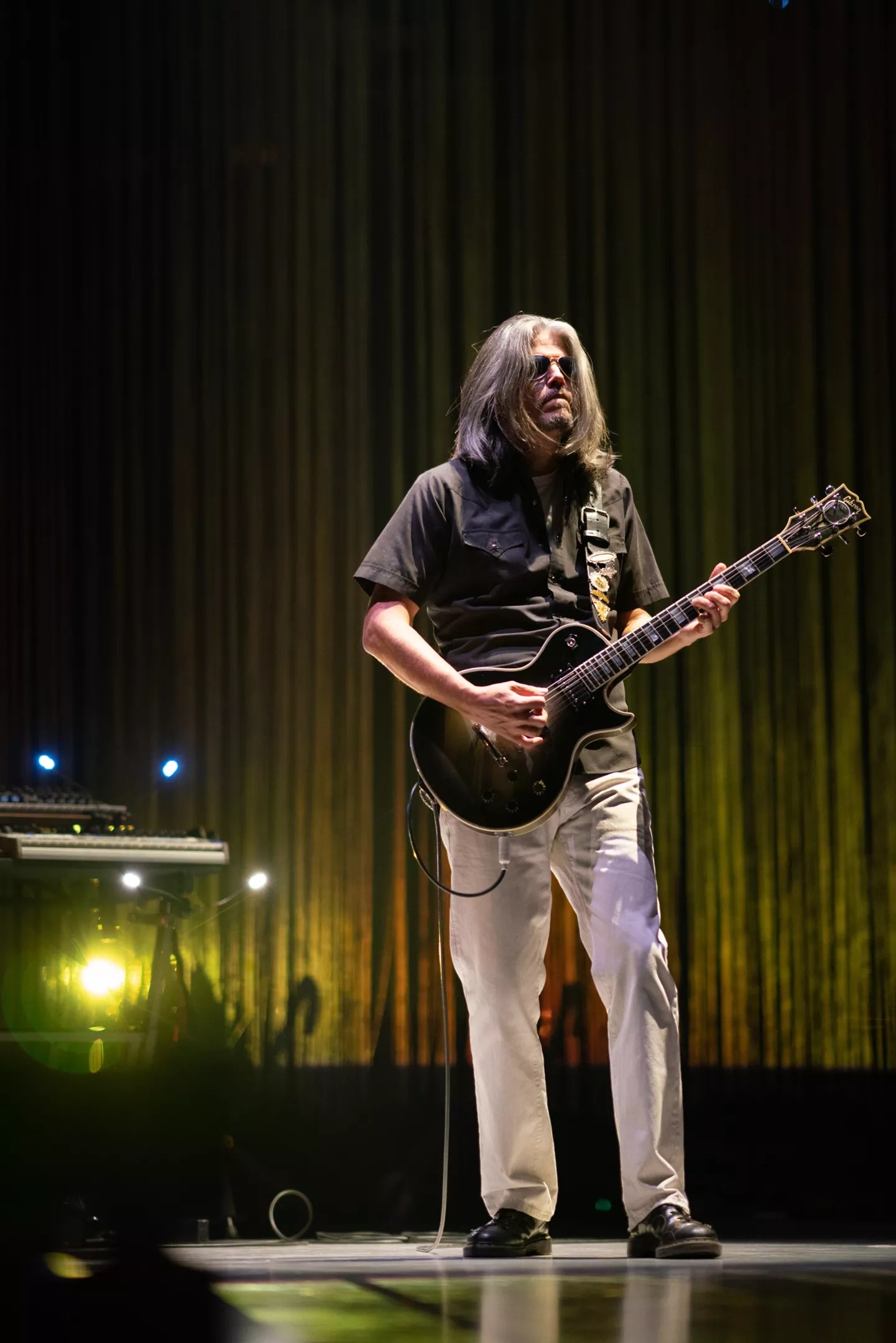 Wearing a Suns jersey, drummer Danny Carey took to the stage first, mounting a riser as haunting video projections of faces with exposed muscle and bulging eyes floated across the curtain of strings. Bassist Justin Chancellor and guitarist Adam Jones came out next, flanking Carey on the ground floor of the stage.