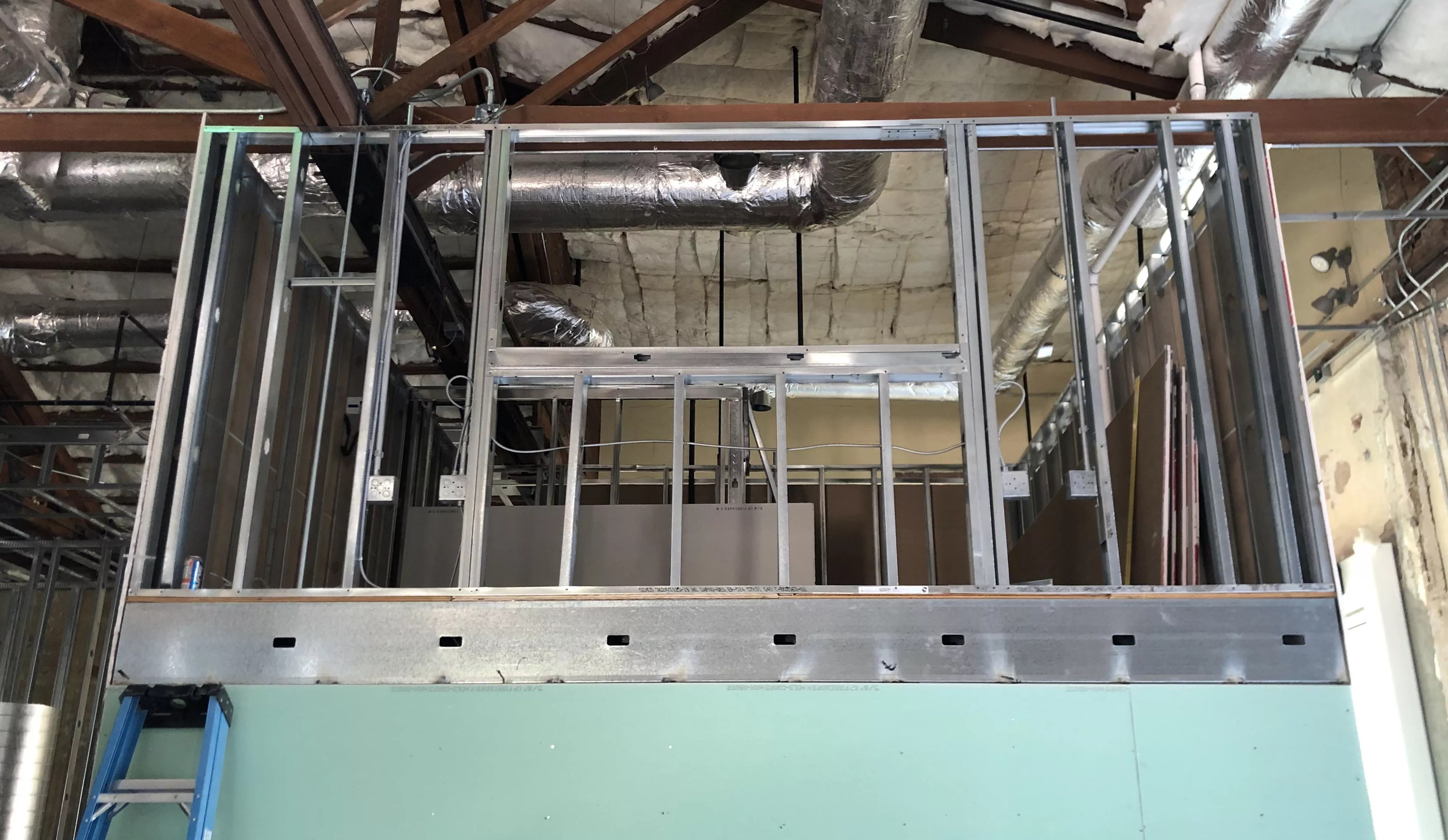 The crow’s nest-style DJ booth under construction in the bar area of Track Club.