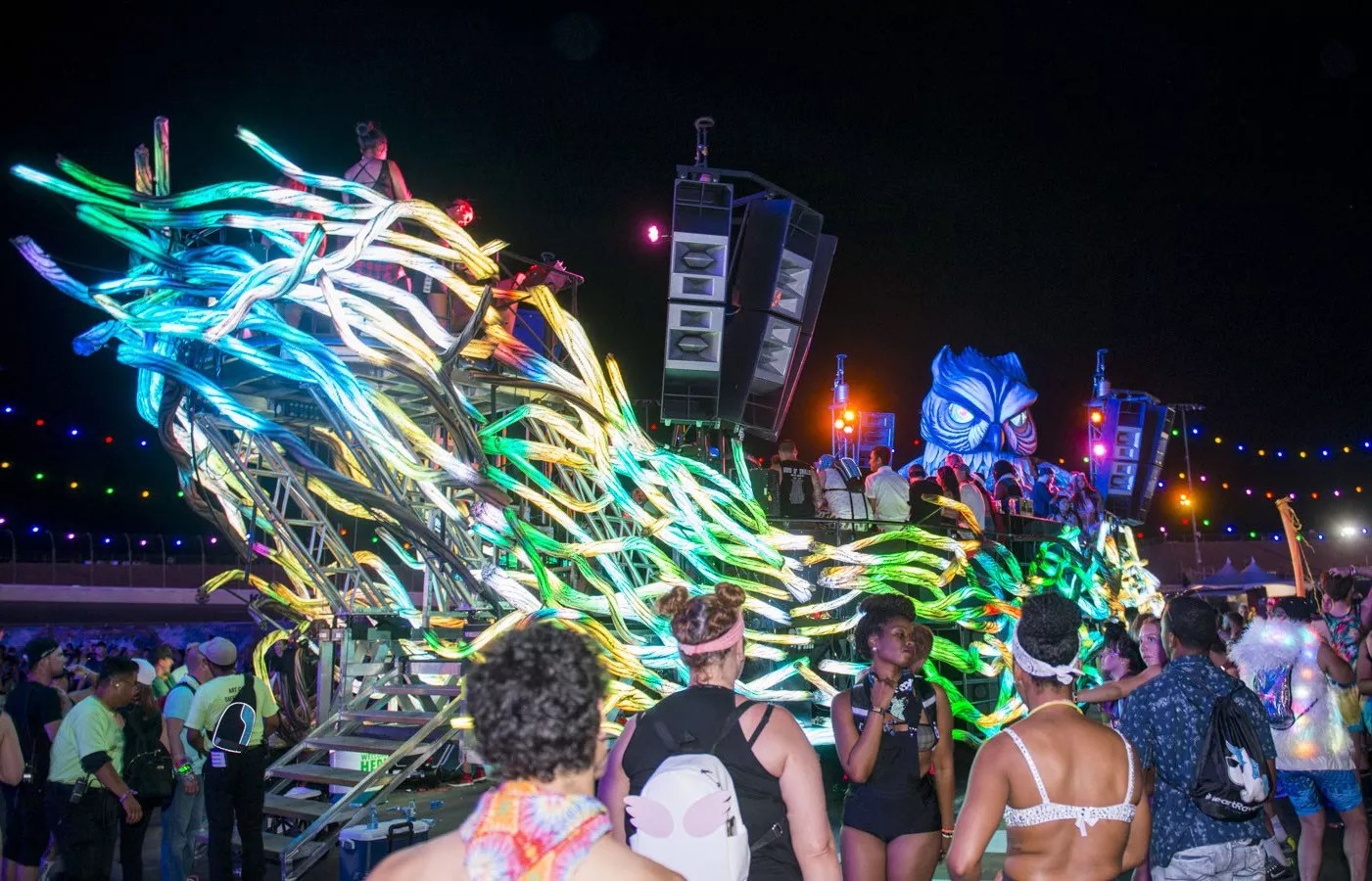 Electric Daisy Carnival’s newest addition, the Parliament Art Car, is parked outside the gates of the festival’s massive Kinetic Field stage. An exclusive group of partygoers have been admitted onto the second story dance floor of the open-air, triple decker bus. They’re drinking from the private bar’s red Solo cups and dancing to headliner Troyboi’s trap beats as they reverberate from the car’s boisterous Funktion-One sound system. The party has spilled out onto the hard pavement of the Las Vegas Motor Speedway, and a copious crowd of dancers are disrupting the flow of fans headed to see Tiesto.