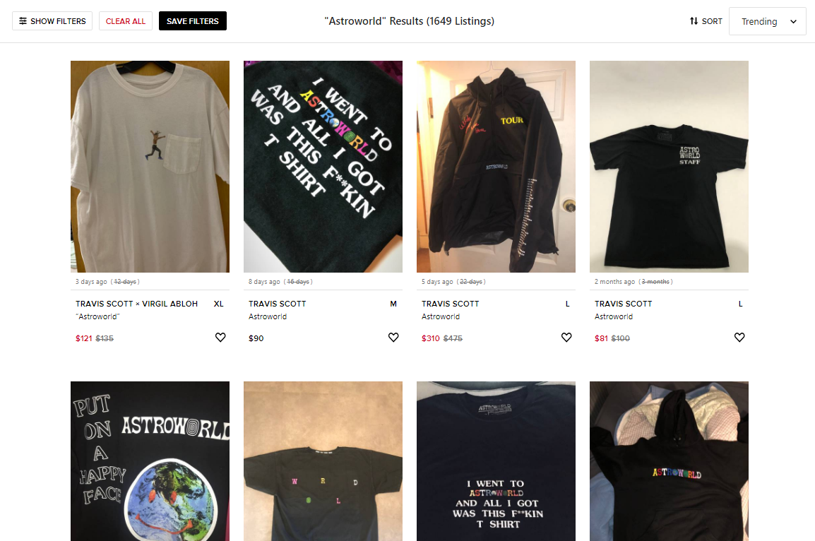 A screenshot of the “Astroworld” search results on Grailed.
